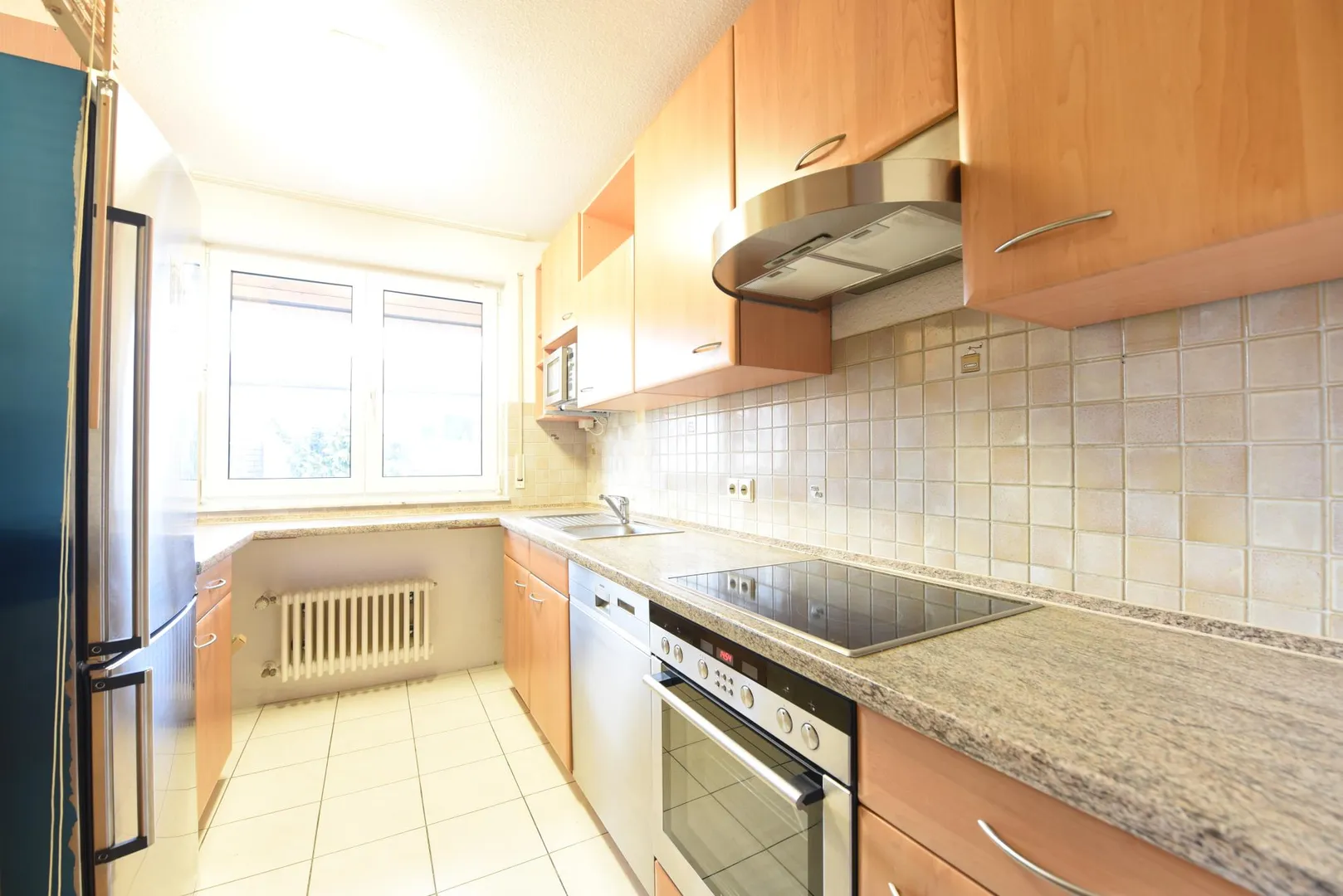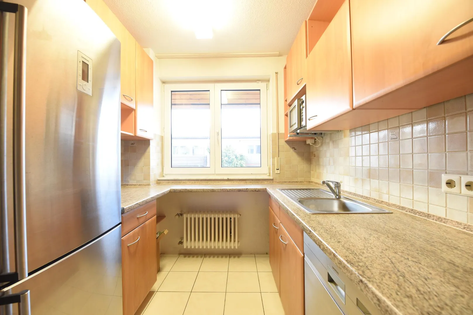 Die Küche ist mit einem Fliesenboden und Küchenmöbeln ausgestattet. Die guten Elektro-Geräte der Marke "Siemens" sowie ein Kleiderschrank im Flur kann vom Vormieter für 2.000 EUR übernommen werden.