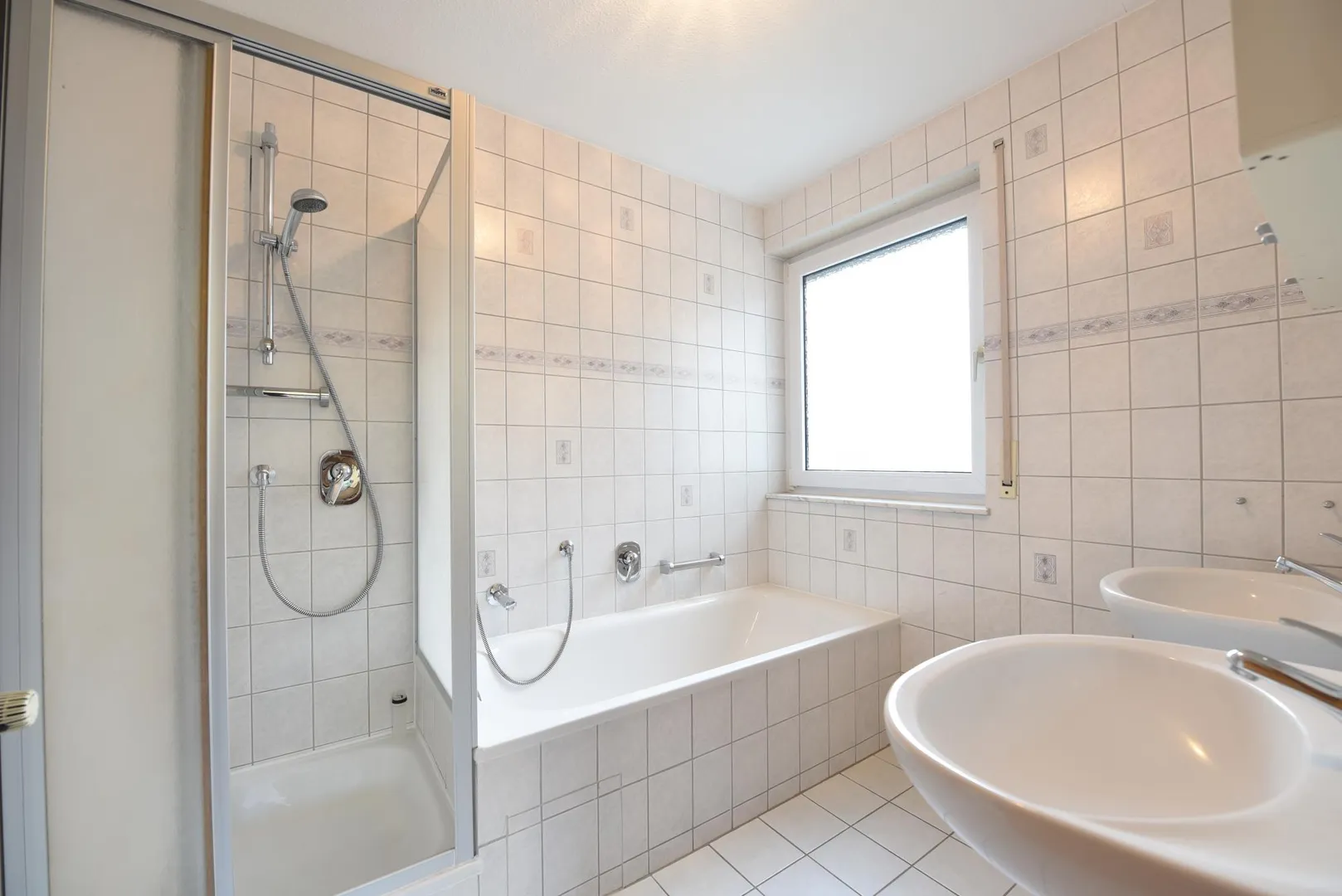 Das raumhoch geflieste Tageslicht-Badezimmer ist ausgestattet mit einer Badewanne, einer Dusche, einem Fliesenboden, zwei Waschbecken sowie einem Spiegelschrank.