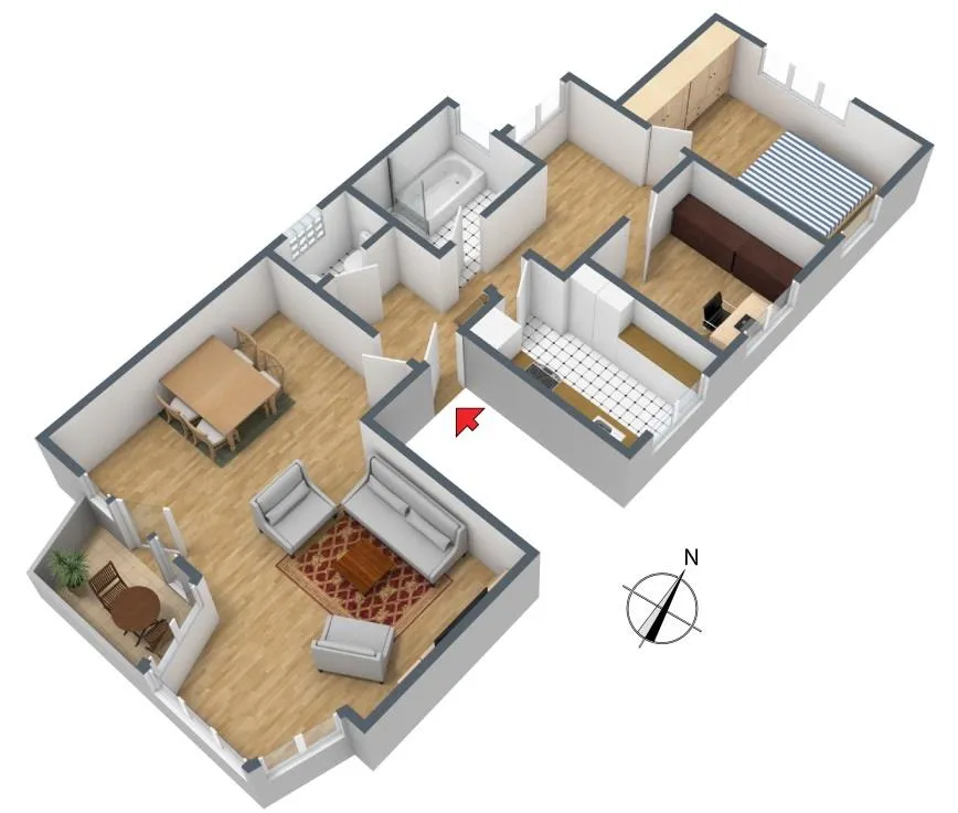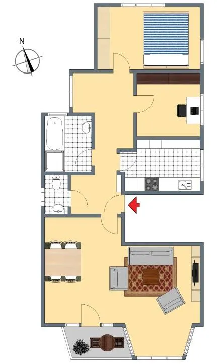 Der Grundriss der Wohnung ist sehr gut. Alle Räume sind direkt vom Flur begehbar. Das Badezimmer verfügt über ein Fenster. Das geflieste WC ist separat. Der ca. 3,7 m² große und überdachte Süd-Balkon ist über das Wohnzimmer begehbar.