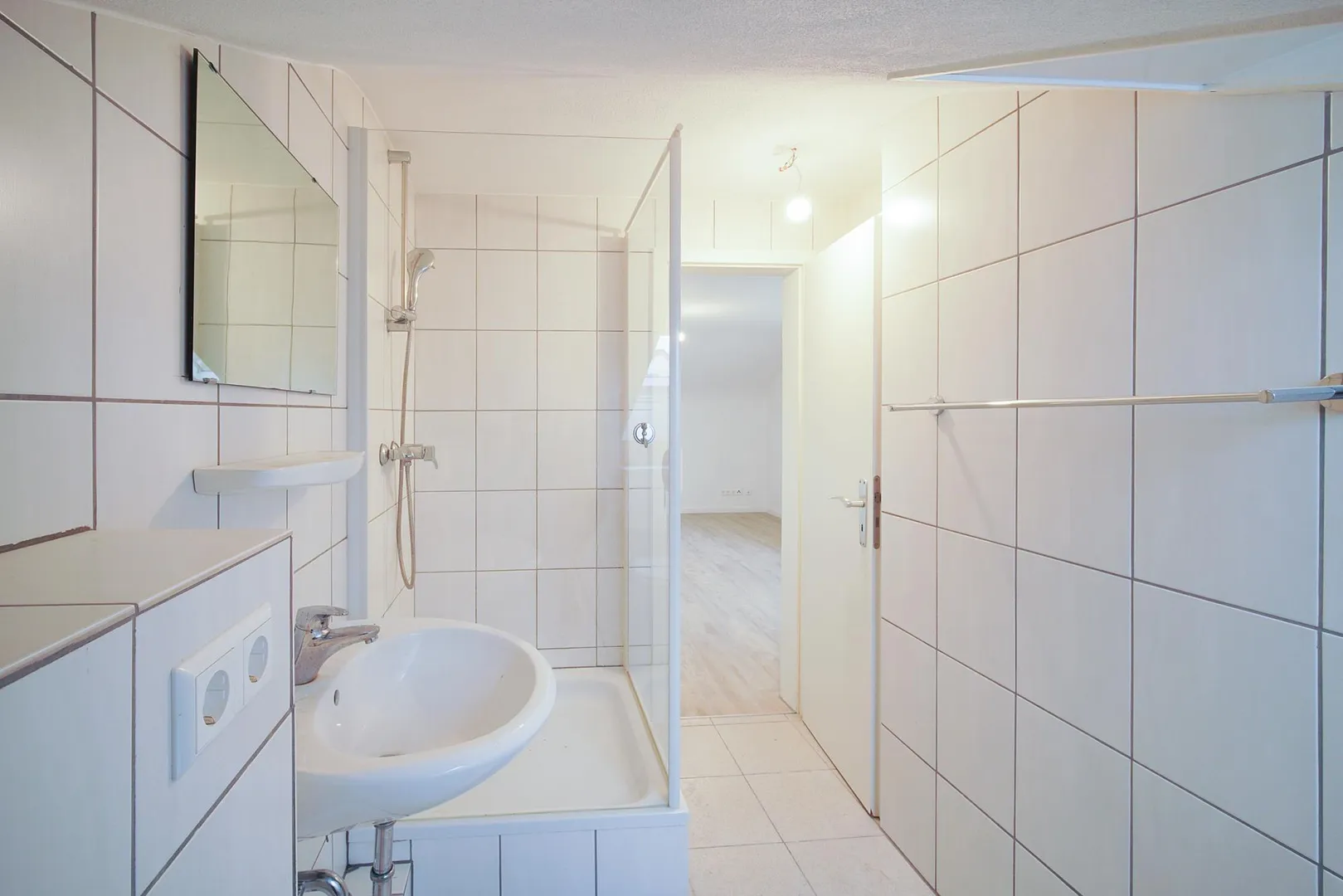 Das raumhoch geflieste Badezimmer ist ausgestattet mit einer Dusche, einem WC sowie einem Waschbecken.
