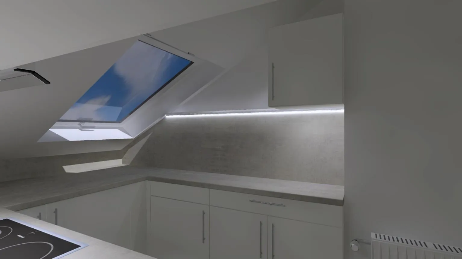 Die offene Küche verfügt über einen Fliesenboden, eine neue Einbauküche sowie einen Abzug nach außen.
