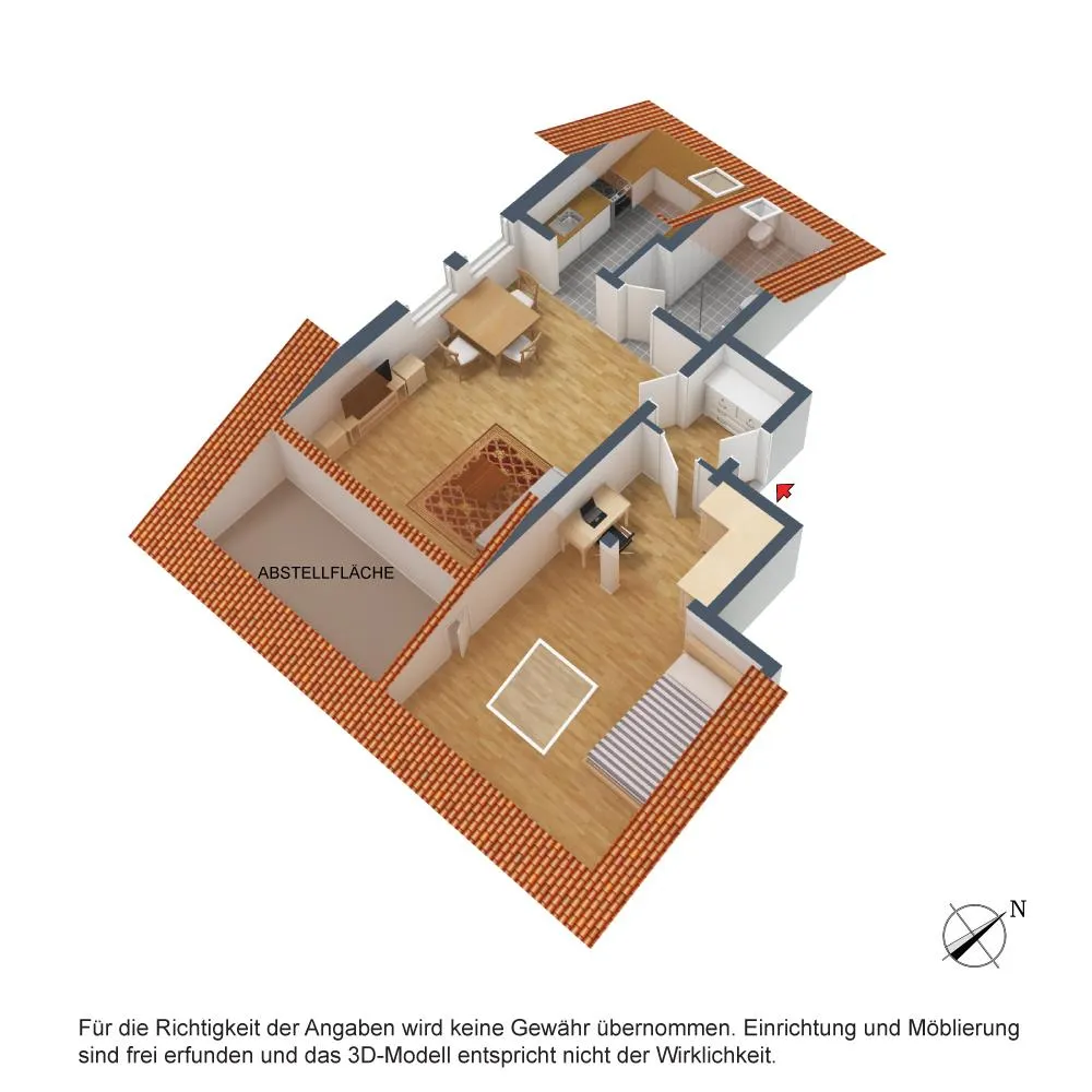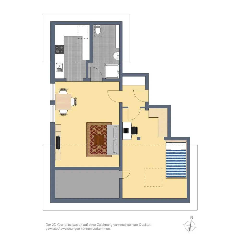 Das Schlafzimmer ist nach Süden, das Wohnzimmer nach Westen und die Küche sowie das Badezimmer nach Norden ausgerichtet.