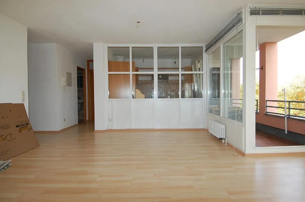 Das Besondere an dieser Wohnung sind der nicht rechtwinklige Grundriss (siehe Grundrisse anbei), eine "verglaste" Küche und eine große Loggia, welche von den beiden Zimmer zugängig ist.