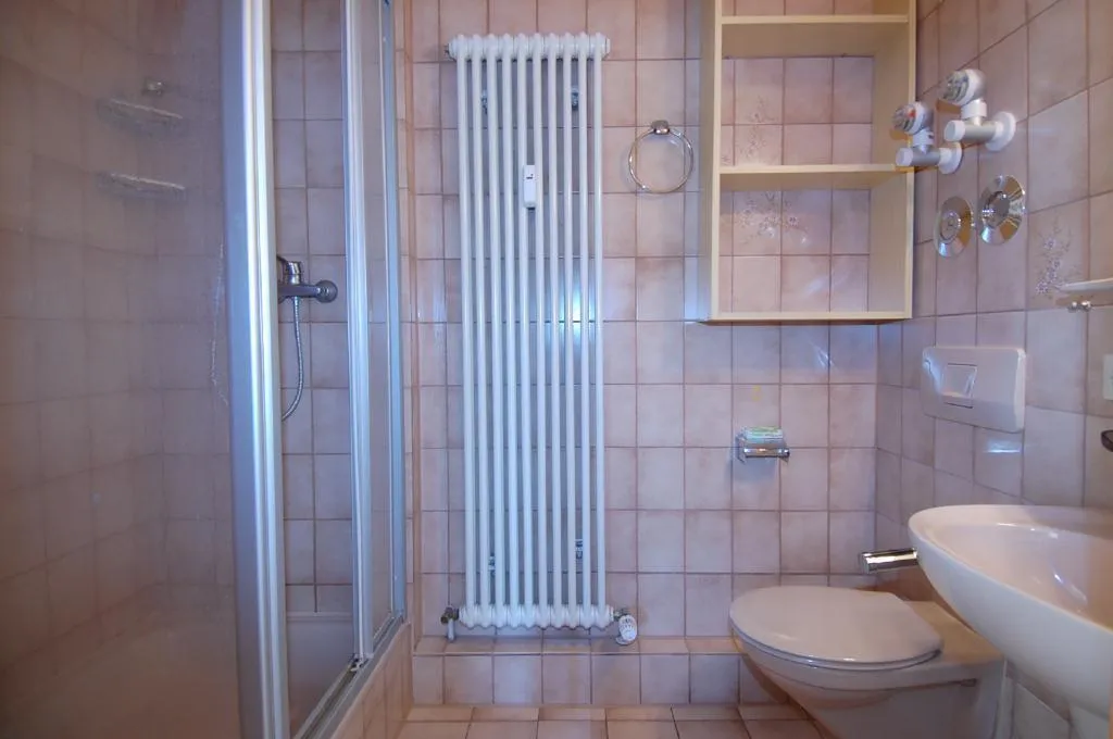 Das Badezimmer ist raumhoch gefliest und ist ausgestattet mit einer Dusche, einem WC und einem Waschmaschinenanschluss.