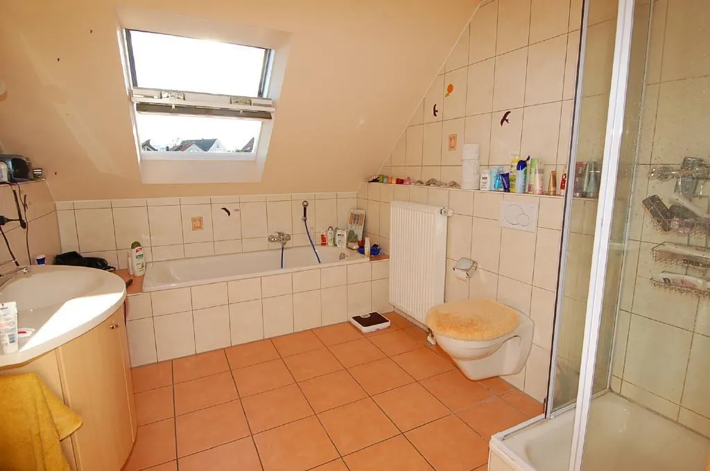 Dachgeschoss 1: 3 Zimmer und ein Badezimmer. Das Tageslicht-Badezimmer ist ausgestattet mit einem Fenster, einer Wanne und einer Dusche.