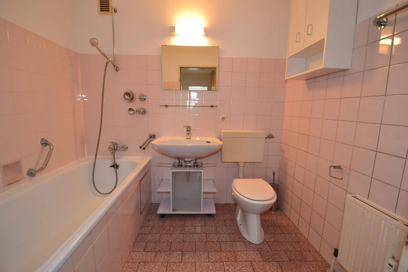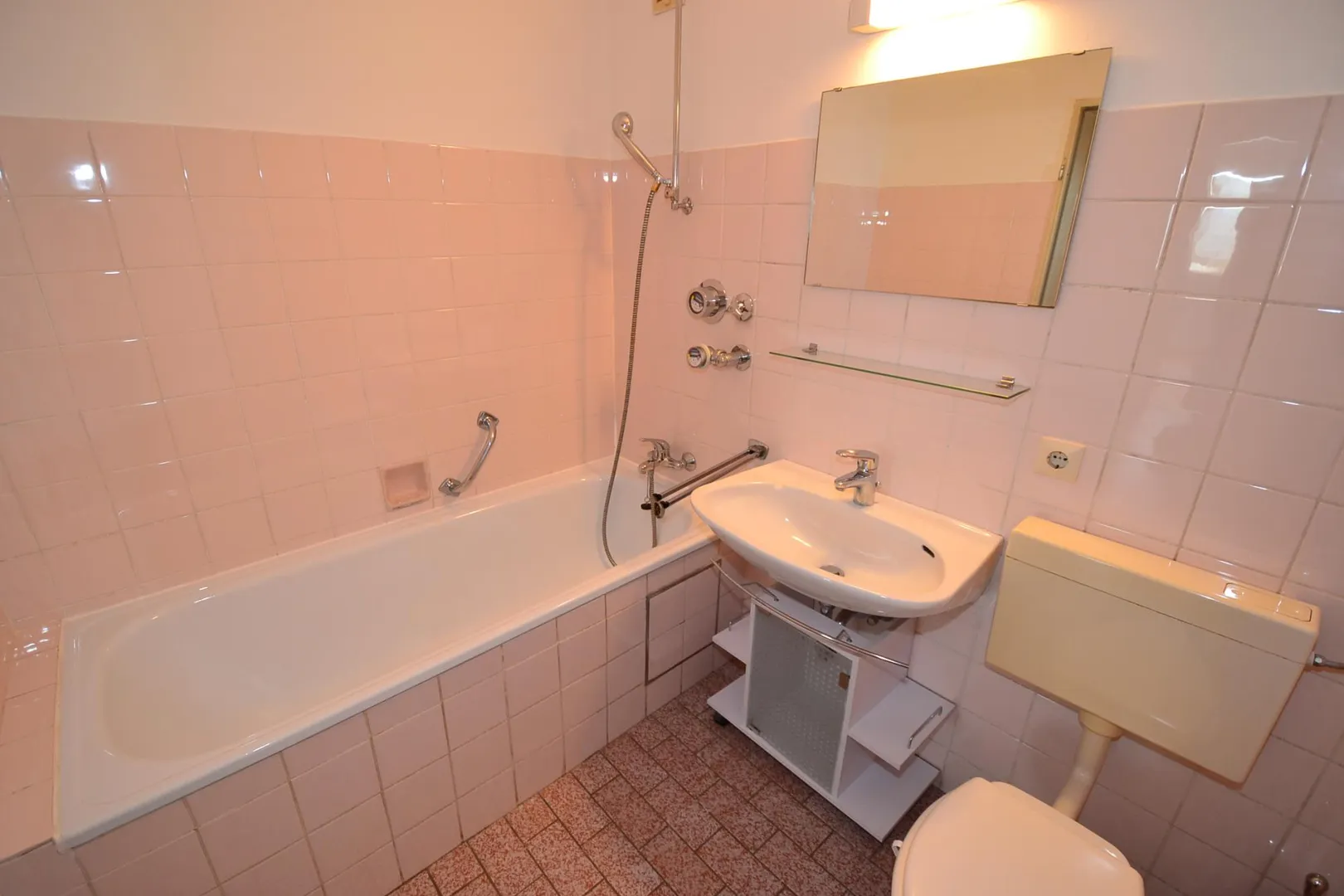 Das halbhoch geflieste Bad aus dem Ursprungsbaujahr ist mit Fliesenboden, Badewanne und WC ausgestattet. Die Armaturen wurden ca. 2006 erneuert.