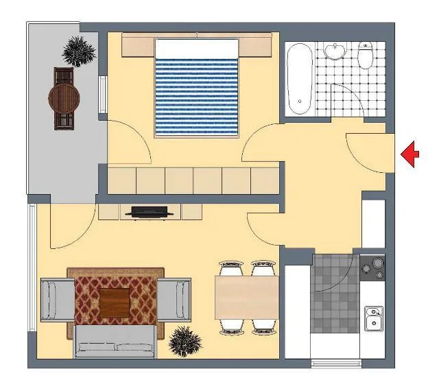 Alle Räume sind vom Flur begehbar. Der Ost-Balkon ist vom Wohnzimmer und vom Schlafzimmer begehbar.