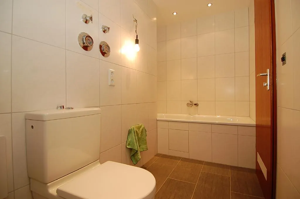 Im raumhoch gefliesten Badezimmer wurde die Decke mit Halogenlampen ausgestattet. Das Bad verfügt über eine Badewanne, einen Fliesenboden, ein WC, einen Handtuchheizkörper, einen Waschmaschinenanschluss, ein Waschbecken mit Unterschrank und Spiegel.