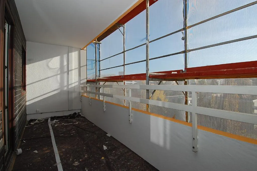 Der überdachte Süd-Balkon ist ca. 8,35 m² groß. Der Balkon und die Fassade werden aktuell modernisiert. Vom Balkon haben Sie eine schöne Fernsicht.