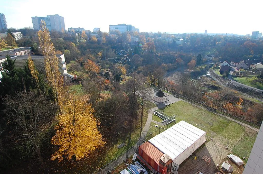 Die Hochhausanlage befindet sich am Ende einer Sackgasse und grenzt direkt an grünes Umfeld mit Schrebergärten, Feldern und Wald.