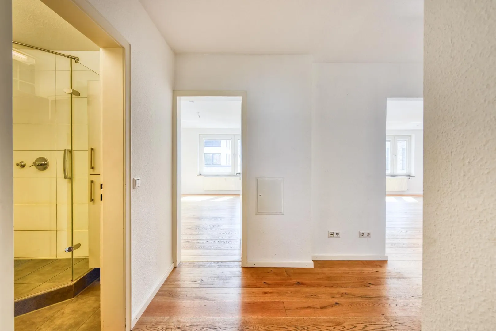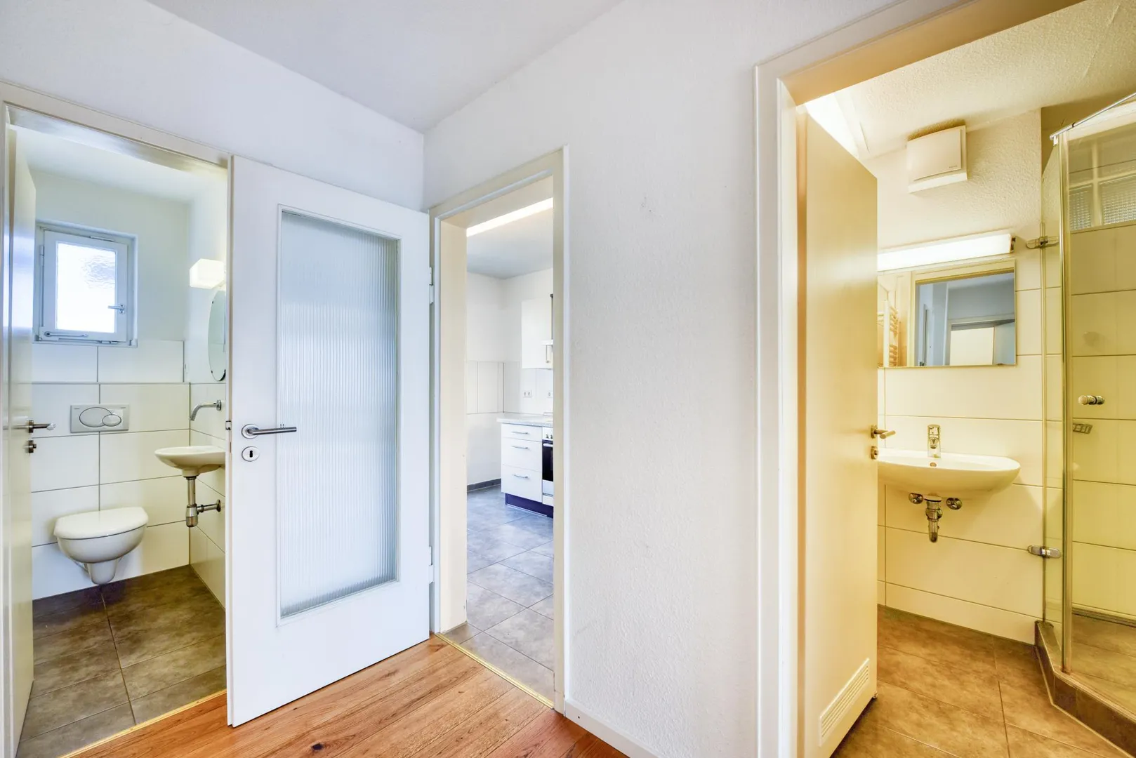 In den Zimmer und im Flur sind massive Eiche-Landhausdielen verlegt. Die Böden in der Küche, im Badezimmer sowie im WC sind gefliest.