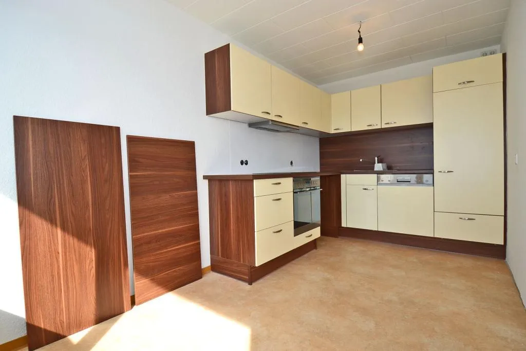 Die Küche verfügt über eine neue Einbauküche. Diese ist ausgestattet mit Kühlschrank mit Gefrierfach, Backofen mit Kochfeld, Spülmaschine, Waschmaschinenanschluss, Ober- und Unterschränken.