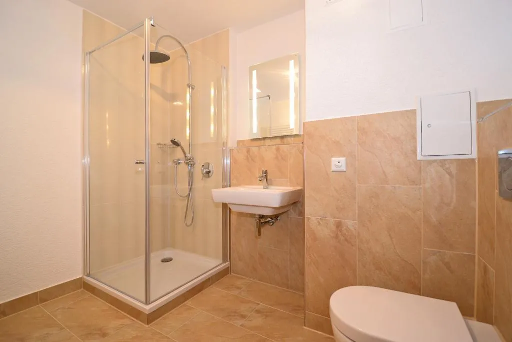Das Badezimmer wurde aktuell komplett modernisiert. Es wurde hochwertig ausgestattet mit Fliesenboden, Dusche, WC, Bidet, Handtuchheizkörper und Spiegel.