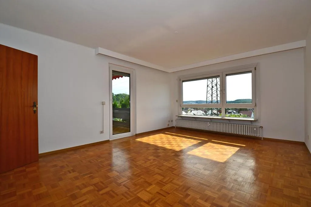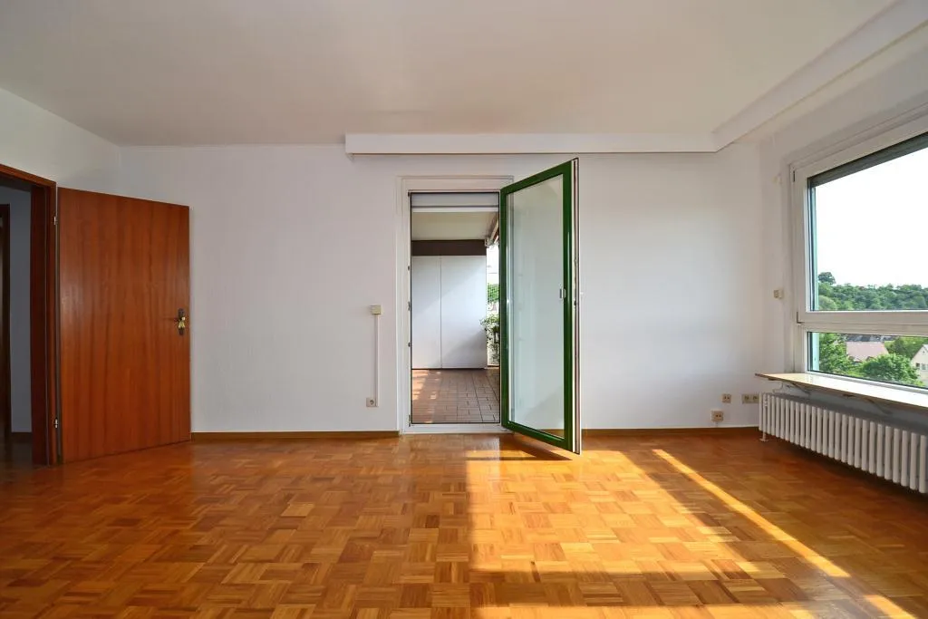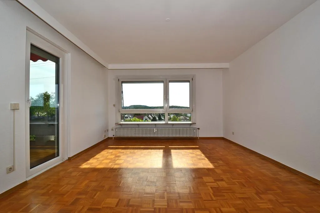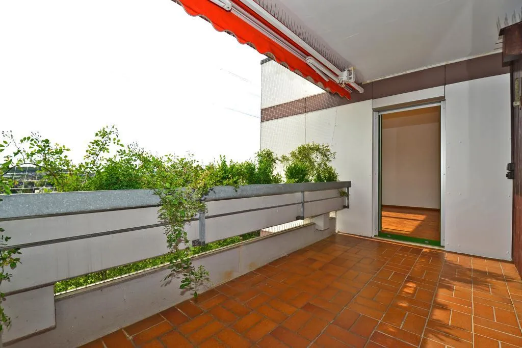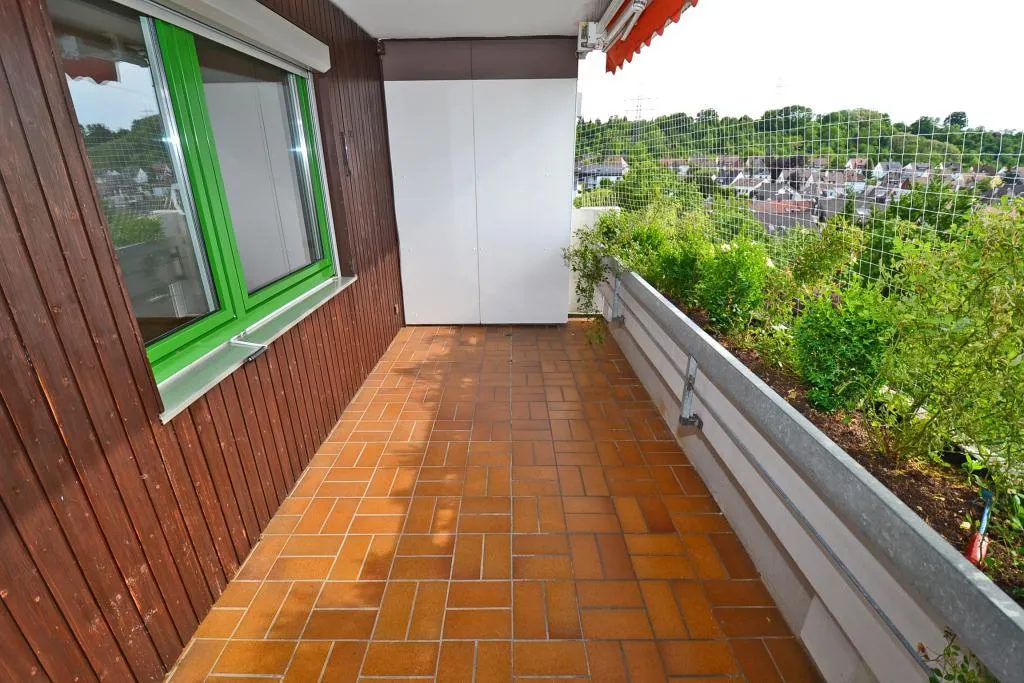 Der ca. 9 m² große und überdachte Balkon ist vom Wohnzimmer begehbar.