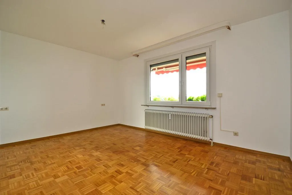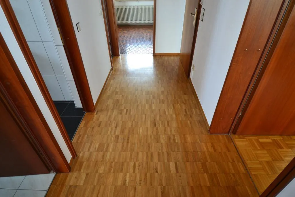 Im Flur und in den Zimmern ist Parkett verlegt. Die Böden in der Küche, im Bad, in der Küche und im Abstellraum sind gefliest.