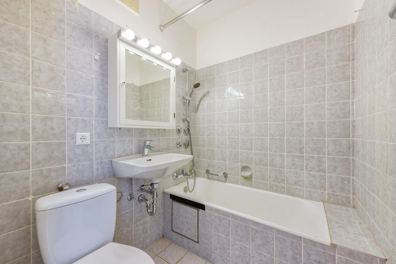 Das ältere, halbhoch geflieste Badezimmer verfügt über eine Badewanne, ein Waschbecken, ein WC, einen Waschmaschinen-Platz sowie einen Spiegelschrank.