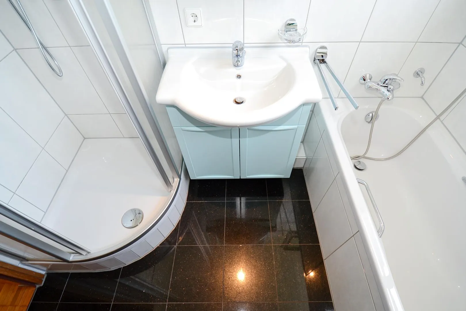 Das raumhoch geflieste Badezimmer ist ausgestattet mit einer weißen Holzdecke, einer Badewanne, einer Dusche, einem Handtuchheizkörper, einem Spiegelschrank sowie einem Waschtisch-Unterschrank.