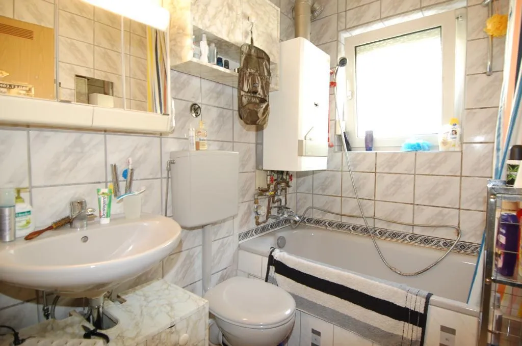Das Badezimmer mit Fenster wurde 2009 teilweise modernisiert. Das Tageslichtbadezimmer ist raumhoch gefliest und ausgestattet mit einer Wanne, einem WC und einem Fliesenboden.
