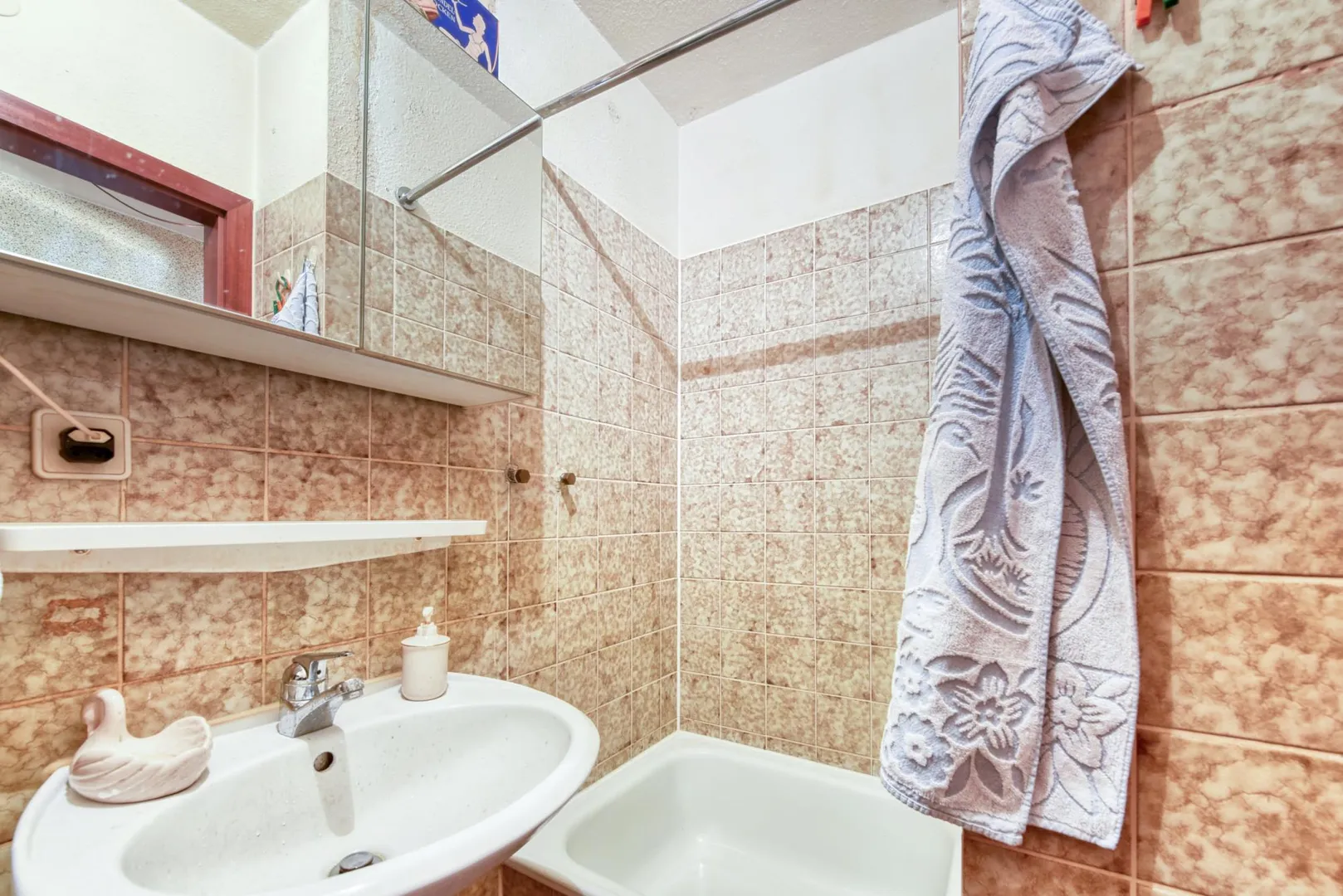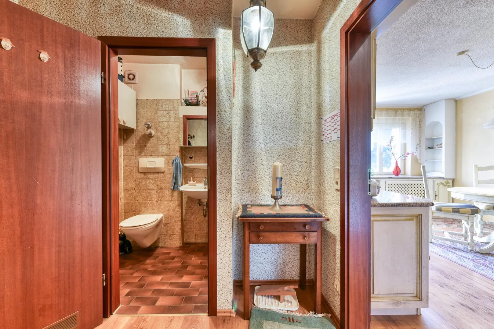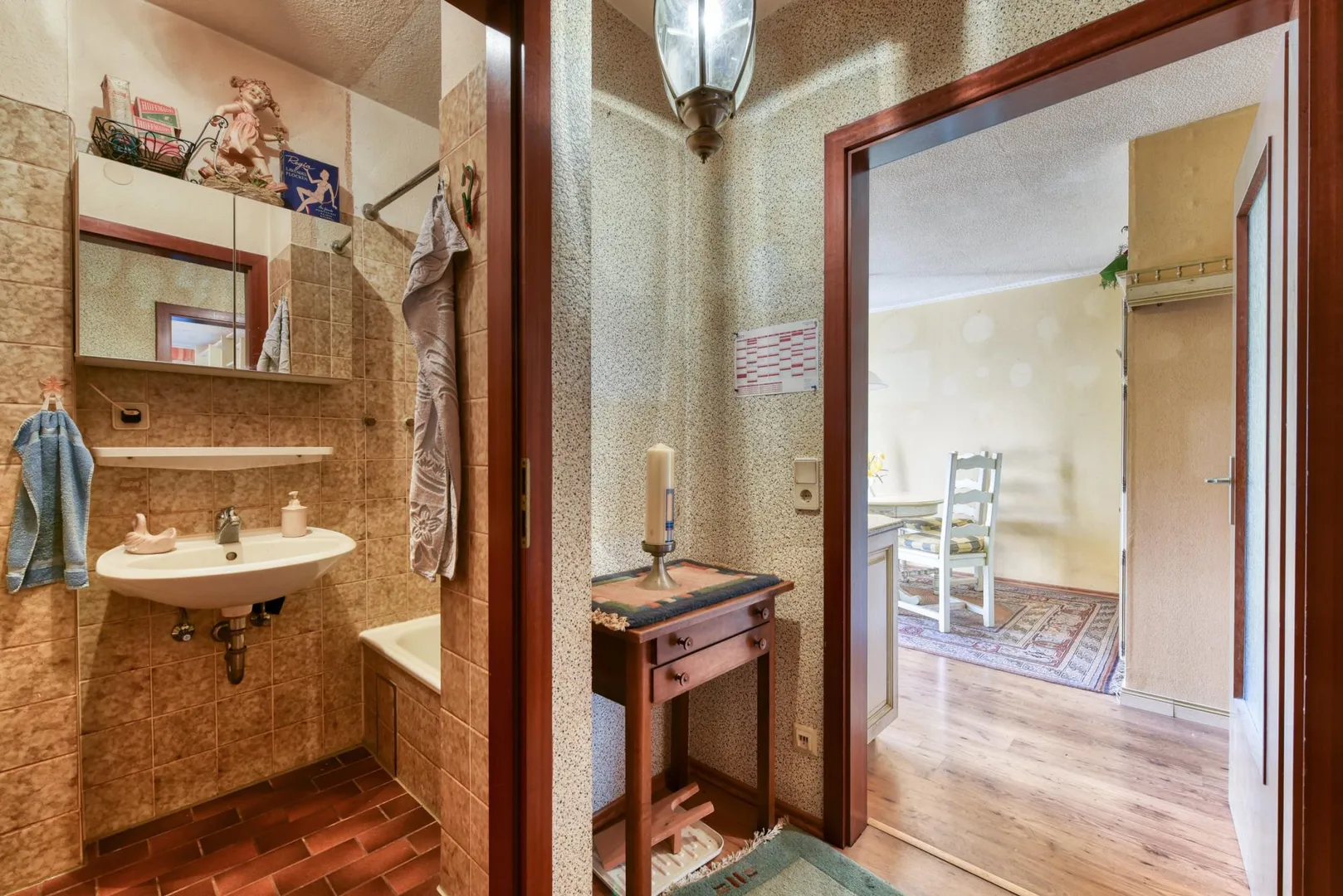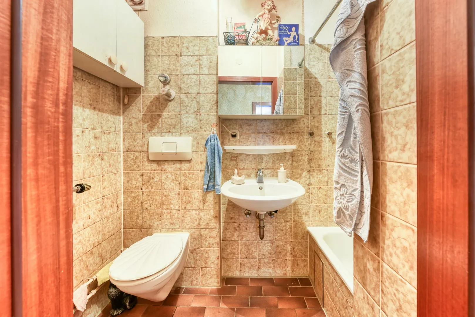 Das ältere, 2/3-hoch geflieste Badezimmer ist ausgestattet mit einer Dusche sowie einem WC.
