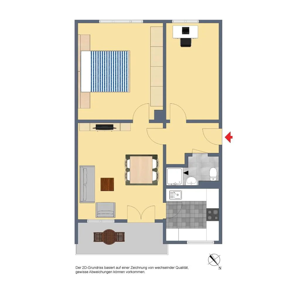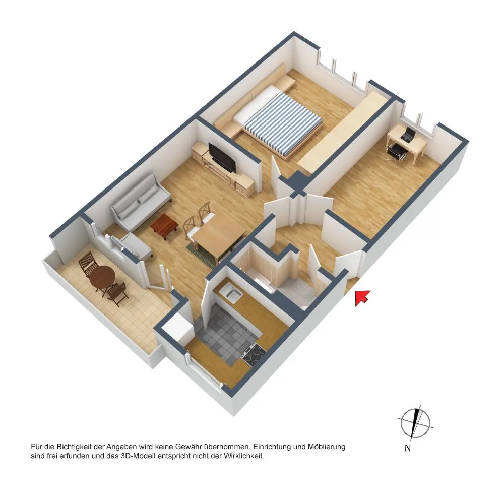 Ebenso über das Wohnzimmer sind die Küche sowie das Schlafzimmer begehbar. Das Badezimmer ist innenliegend.