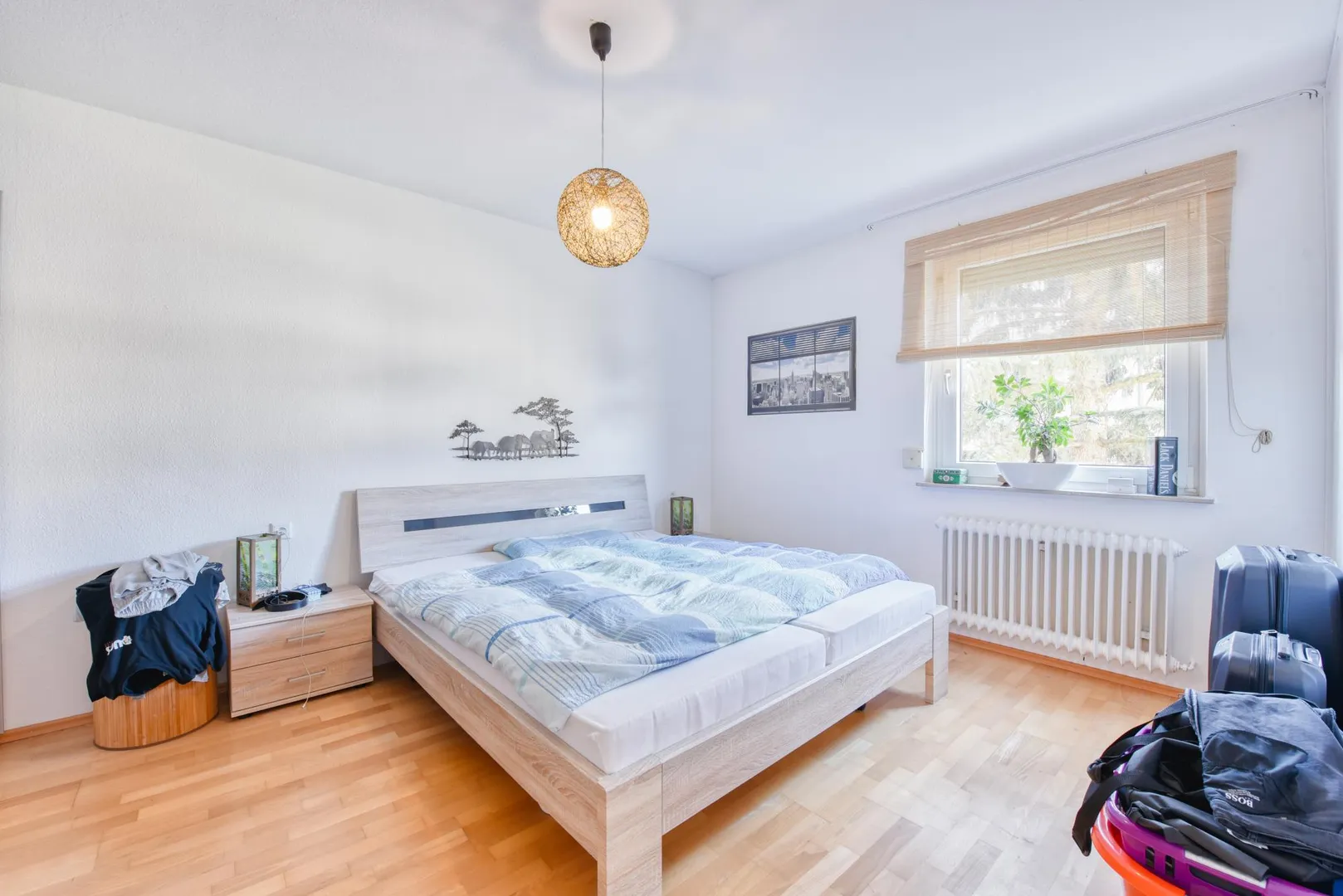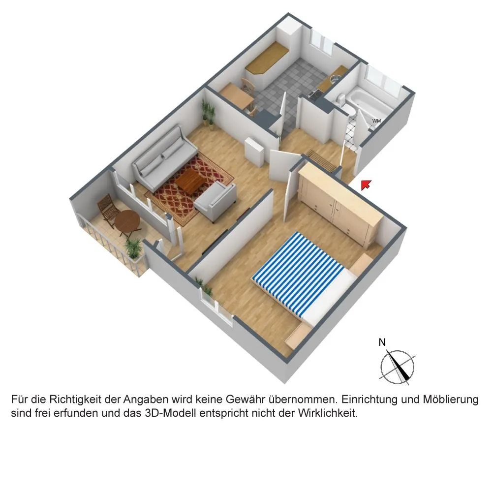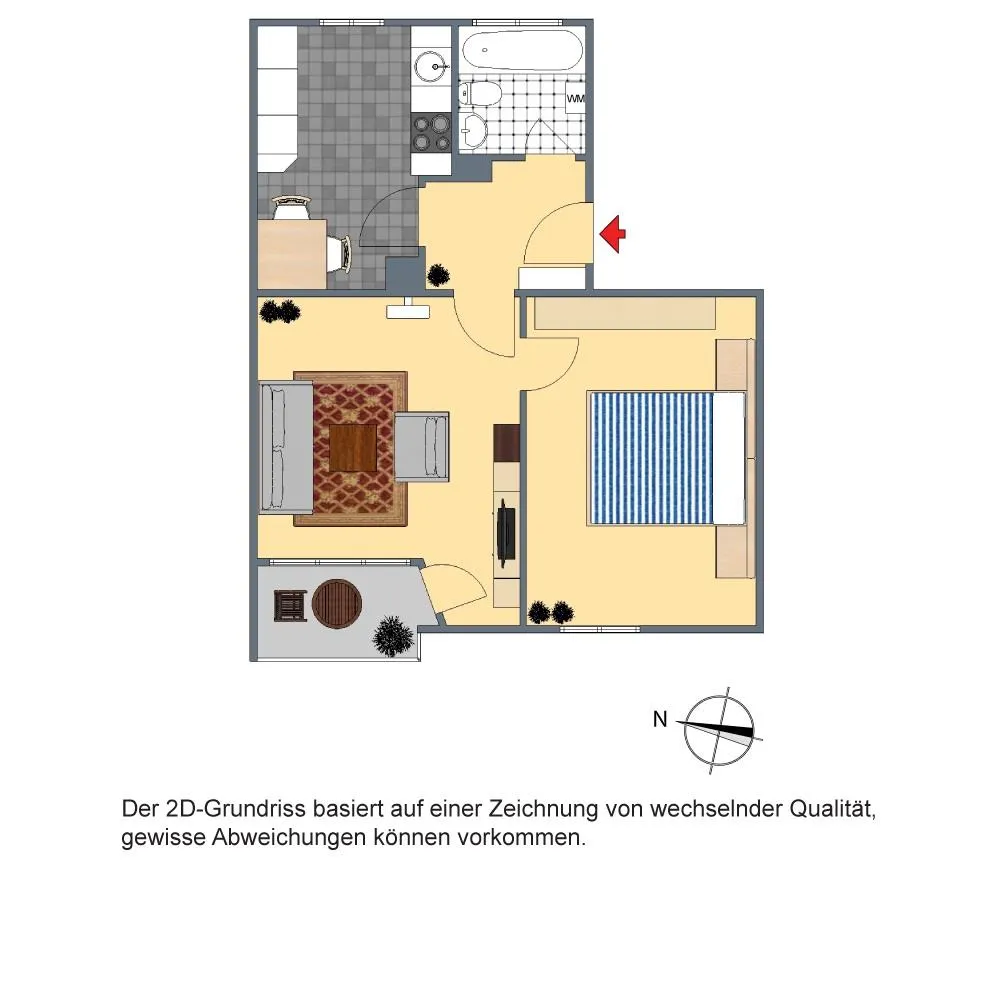 Der Grundriss ist gut. Das Schlafzimmer sowie der ca. 4 m² große und überdachte Balkon sind über das Wohnzimmer begehbar. Das Badezimmer verfügt über ein Fenster.