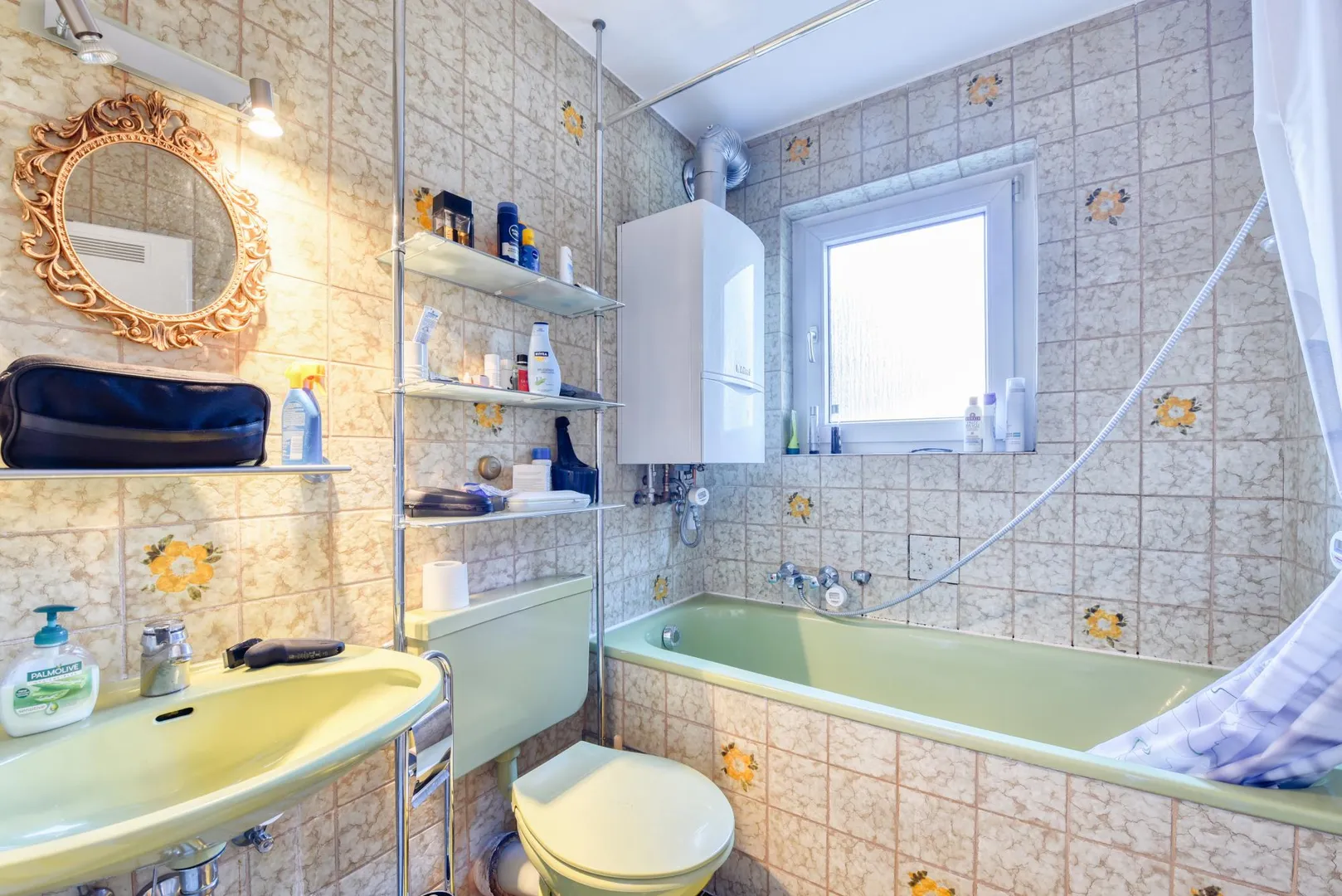 Das ältere Tageslicht-Badezimmer ist raumhoch gefliest und ist mit einer Badewanne sowie einem WC ausgestattet.