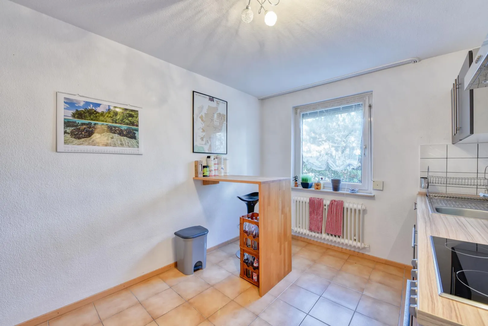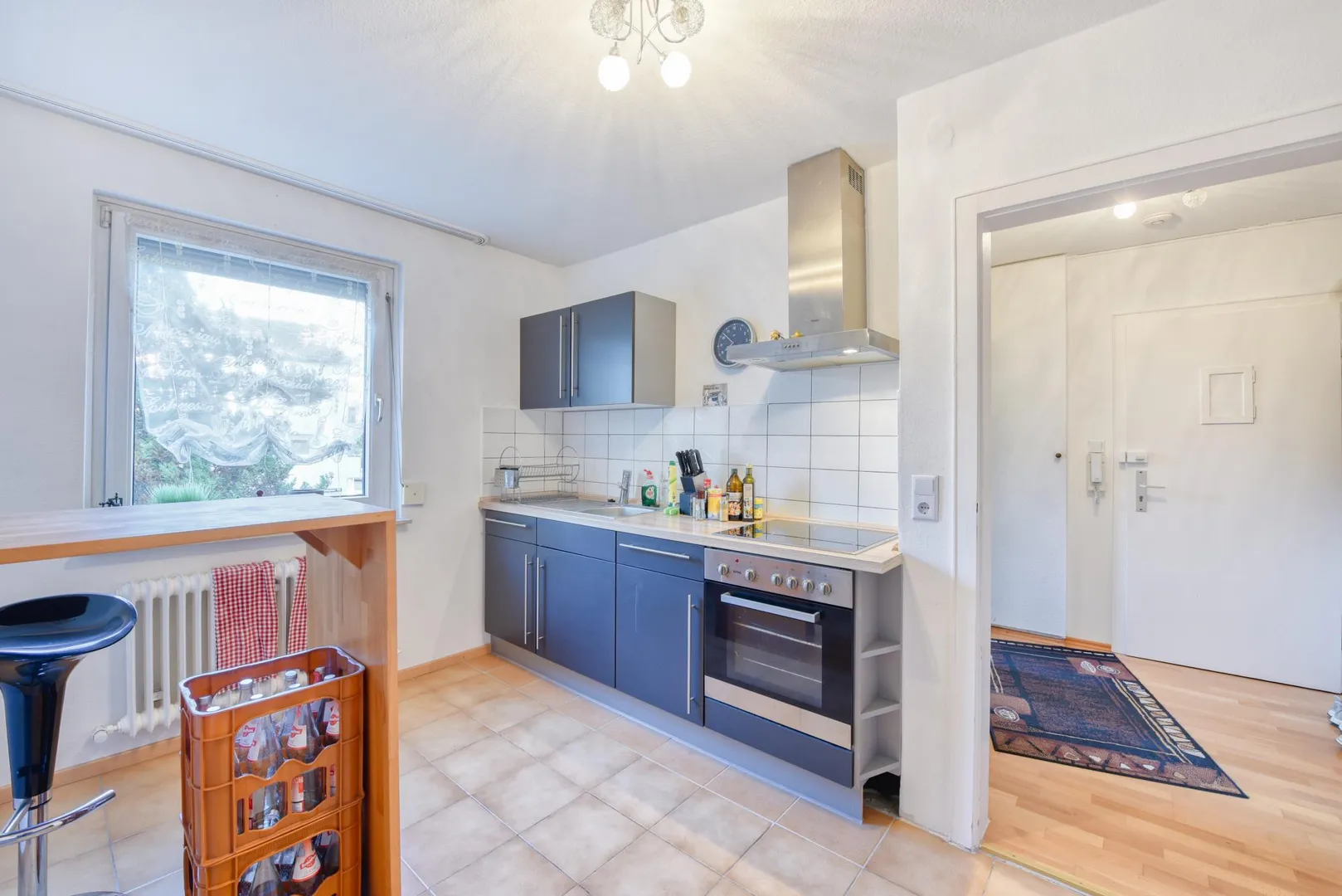Die Zimmer und der Flur sind mit Parkett-Böden ausgestattet. Die Böden in der Küche sowie im Badezimmer sind gefliest.
