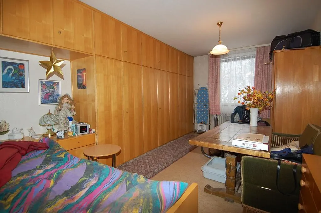 Das Schlafzimmer ist ebenfalls nach Süden ausgerichtet. Dort ist ein Linoleum-Boden verlegt.