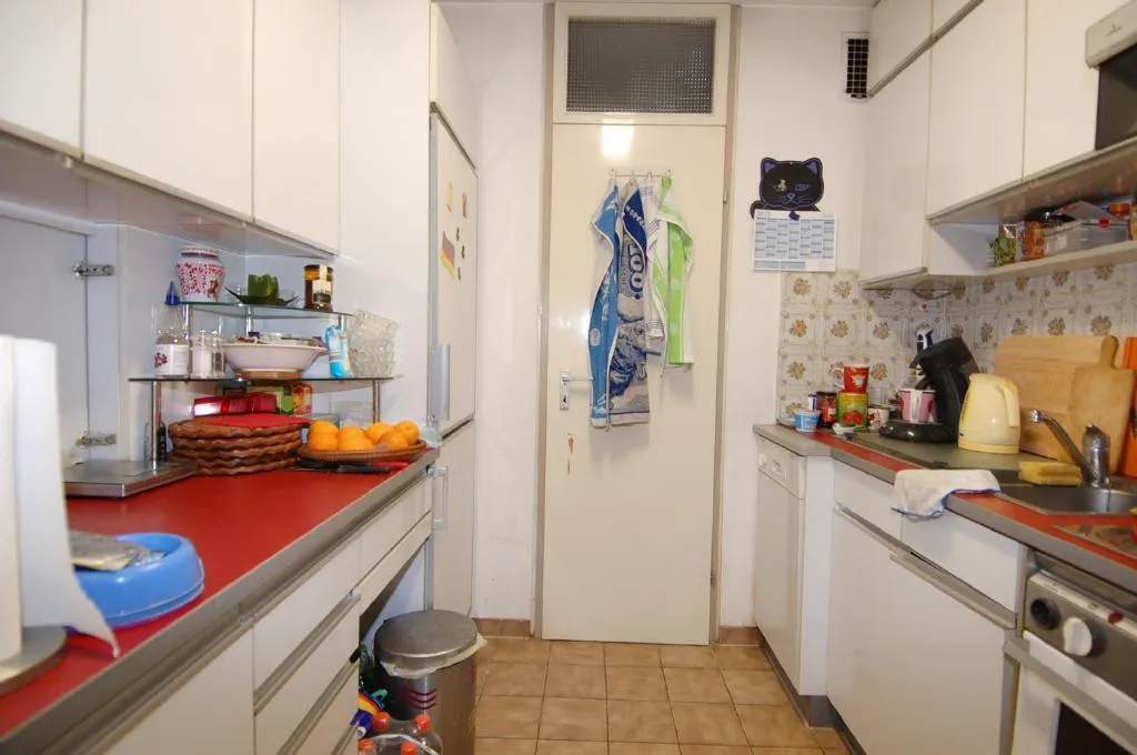 Die Küche ist mit einem hellen Fliesenboden ausgestattet. Sie verfügt über eine ältere Einbauküche mit einem Dunstabzug mit Filter, einem Herd/Backofen, einer Kühl-/Gefrierkombination, einer Geschirrspülmaschine, weissen Ober- und Unterschränken sowie einer angrenzenden, ca. 2 m² großen Speisekammer.