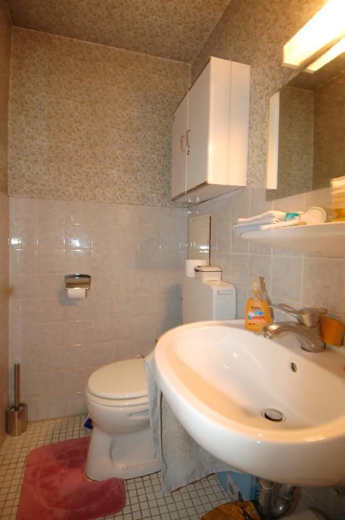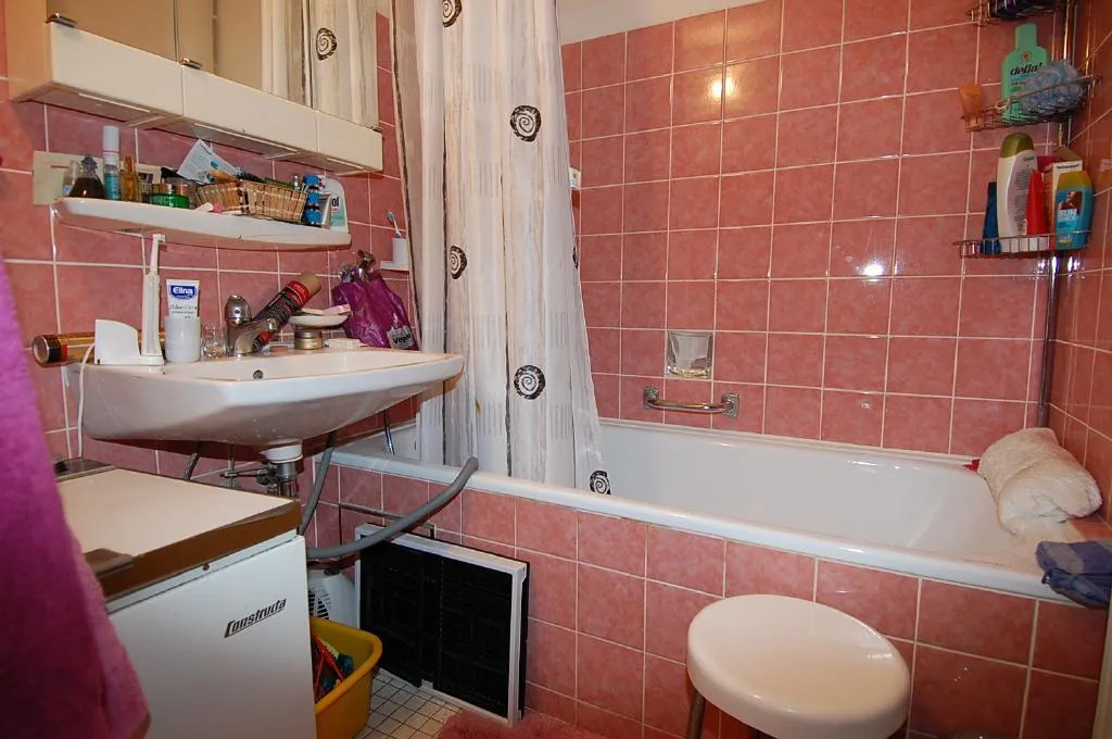 Das angrenzende Badezimmer ist in "altrosa" türhoch gefliest. Es mit einer Badewanne und einem Waschmaschinenanschluss ausgestattet.