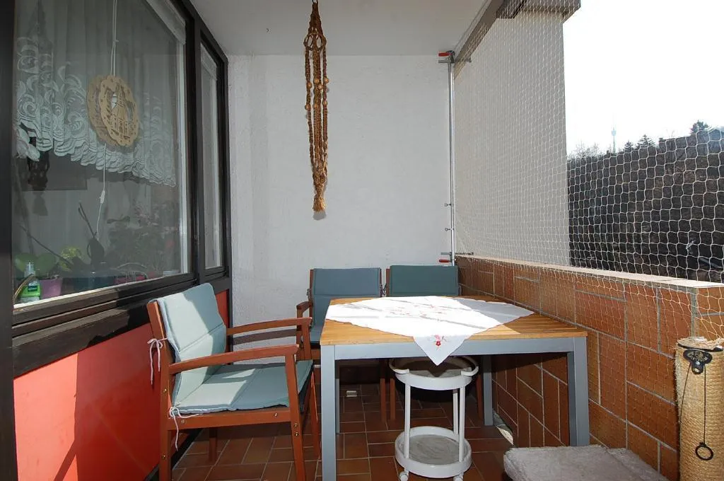 Auf die 5,8 m² große Loggia gelangen Sie vom Wohnzimmer aus. Sie ist nach Süden ausgerichtet, mit einem schönen Blick auf die locker bebauten Hänge des Stuttgarter Süden.
