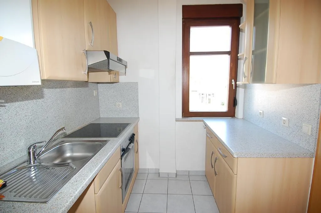 Die Küche verfügt über einen Fliesenboden und einen Waschmaschinenanschluß. Es gibt keinen Heizkörper und der Einbau einer Spülmaschine ist nicht möglich. Die vorhandene, ca. 10 Jahre alte Einbauküche (ohne Spülmaschine) ist für EUR 500.- zu übernehmen.