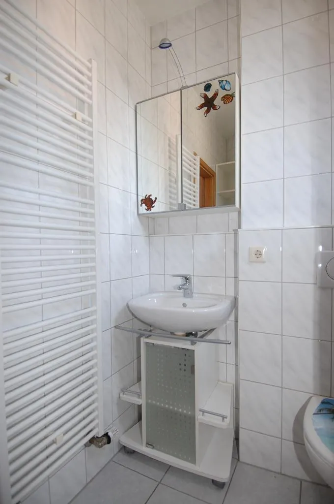 Das Badezimmer, welches über die Küche begehbar ist, wurde 2005 komplett modernisiert und verfügt über moderne Fliesen an Boden und Wänden, ein Fenster, eine Dusche, ein WC und einen Handtuch-Heizkörper.