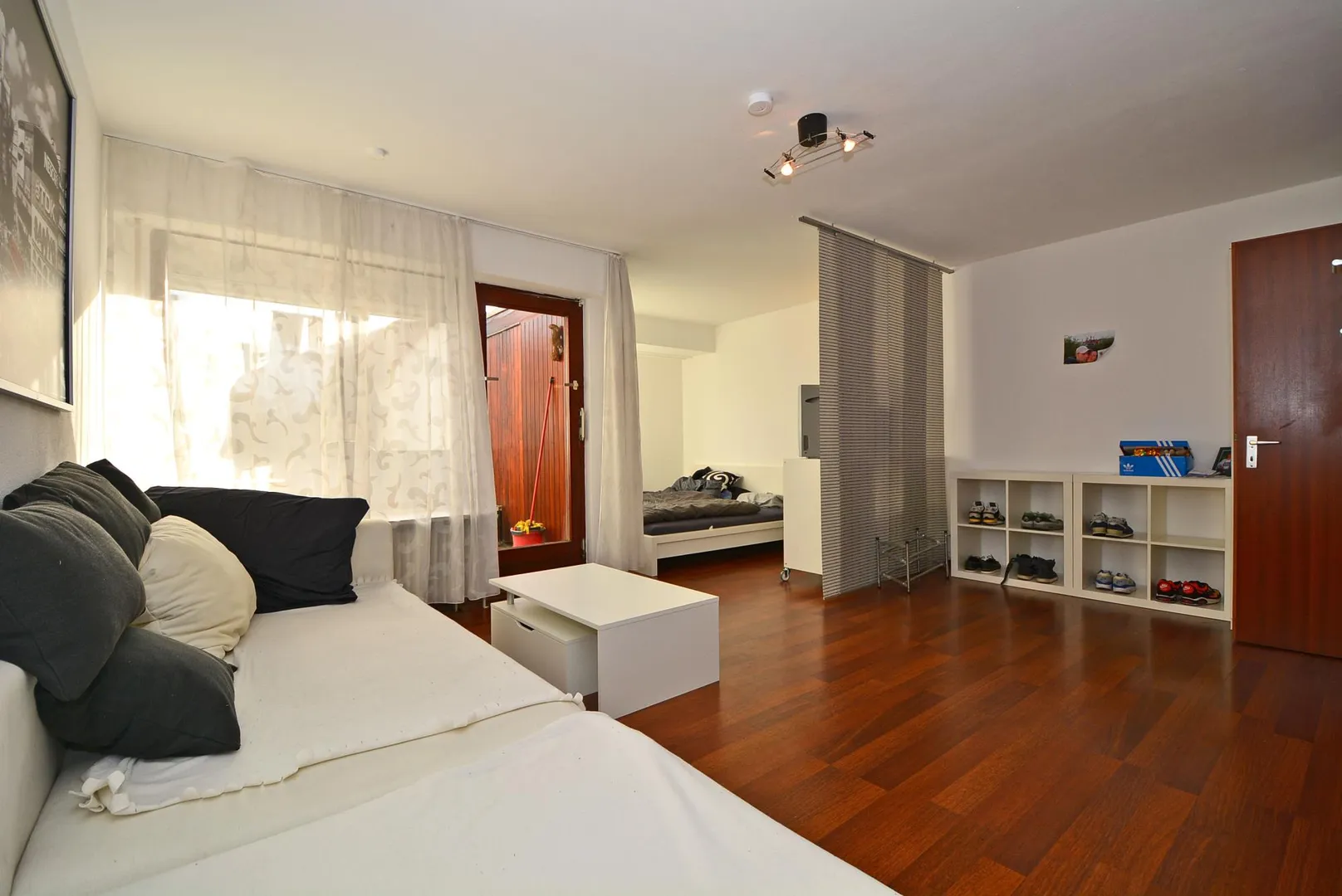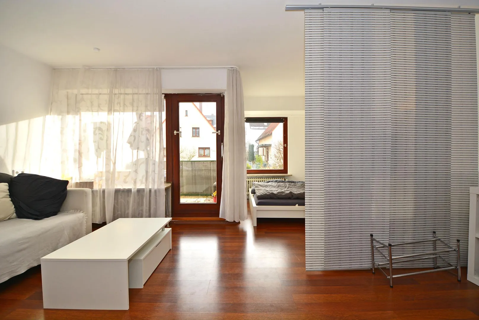 Der Boden im Zimmer ist mit einem Laminatboden ausgestattet. Die Böden im Flur, Bad und in der offenen Küche sind gefliest.