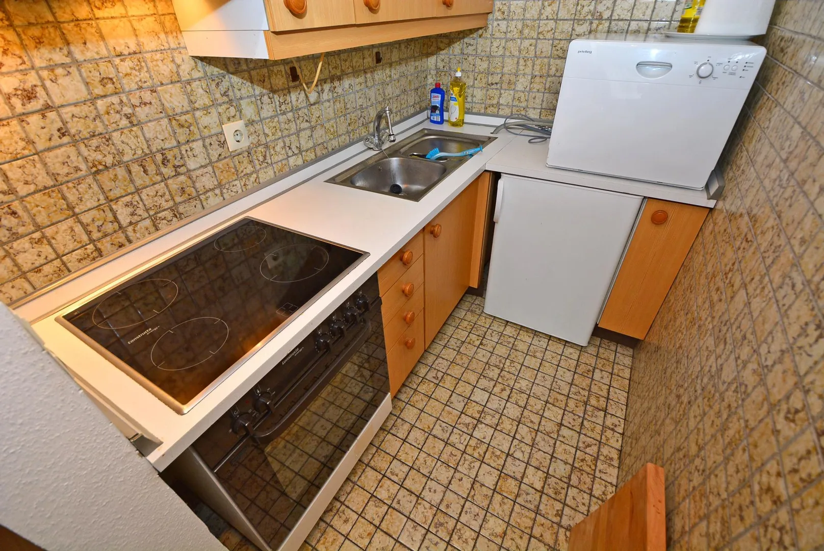 Die offene Küche ist mit einer Einbauküche ausgestattet. Die Einbauküche verfügt über einen Herd mit Backofen und Außen-Dunstabzug, einen kleinen Kühlschrank mit Gefrierfach sowie Ober-und Unterschränke. Eine kleine Spülmaschine kann vom Vormieter übernommen werden.