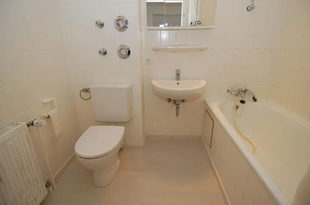 Das Badezimmer ist raumhoch gefliest und verfügt über eine Wanne, ein WC, ein Waschbecken und einen Feuchtraumlaminatboden.