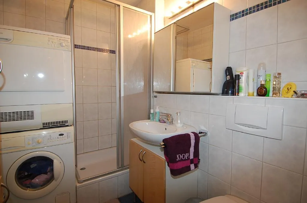 Das Badezimmer mit Dusche ist raumhoch gefliest und verfügt über einen Waschmaschinen - und Trockneranschluss.