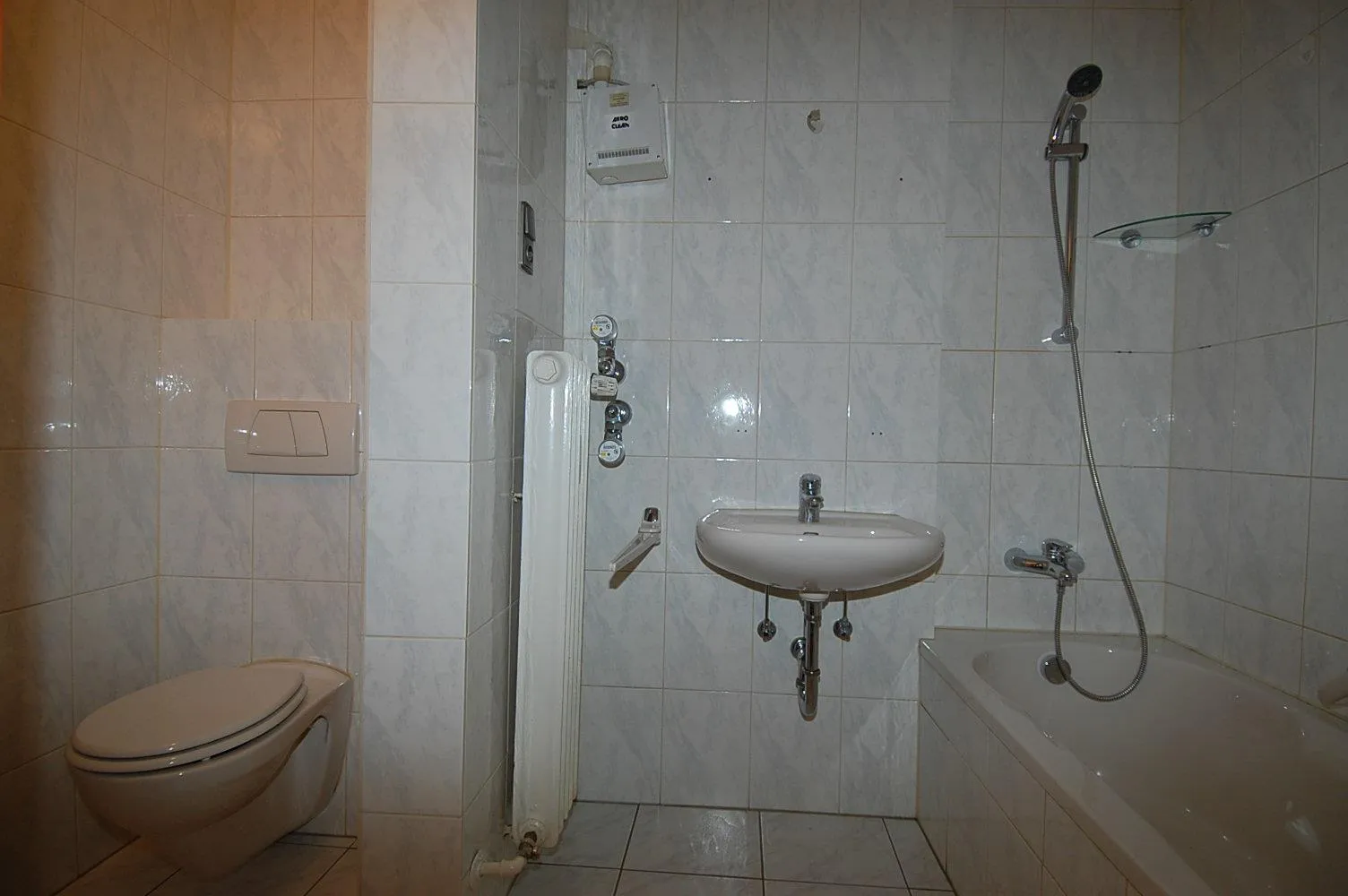 Das Badezimmer ist raumhoch, weiß gefliest. Es ist ausgestattet mit einer Badewanne, einem WC und Waschmaschinenanschluß.