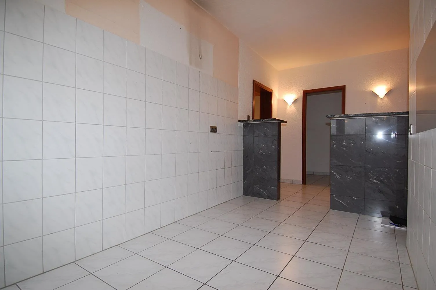 In allen Zimmern - Wohn-, Schlaf- und Kinderzimmer - befinden sich Laminatbodenbeläge. Das Badezimmer mit WC, Flur und Küche sind weiß gefliest.
