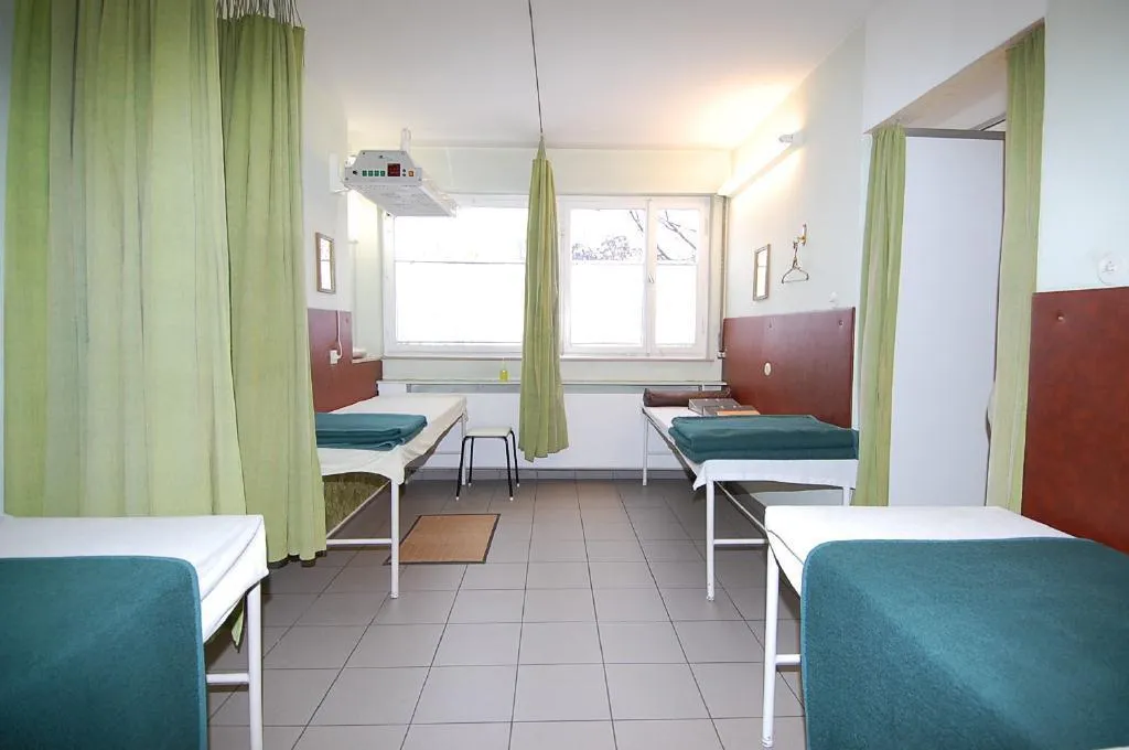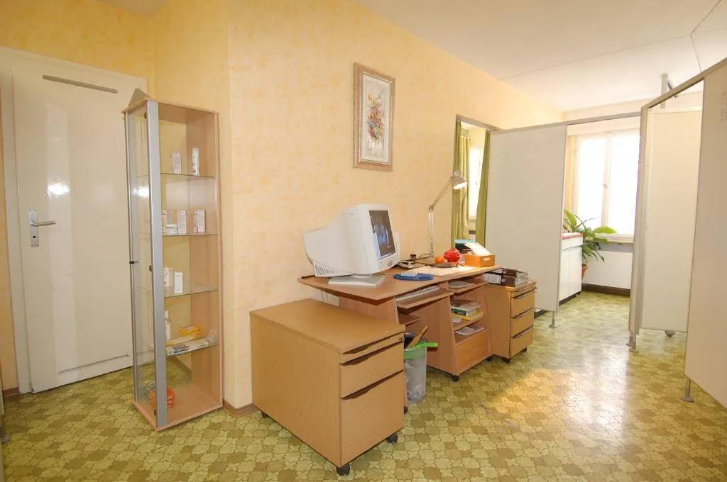 Die Einheit wird aktuell als Massagepraxis genutzt. Diese ist ausgestattet mit einem Gäste-WC im Eingangsbereich, 3 halbhoch gefliesten Bädern mit Badewanne, Bodenfliesen bzw. PVC-Boden in den Räumen und Holzfenstern.