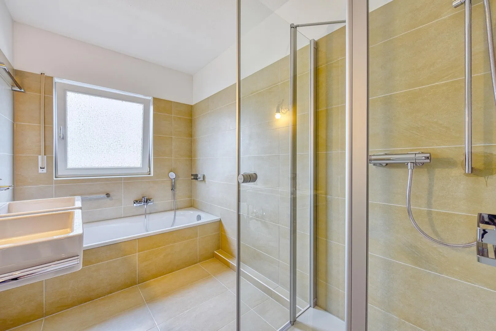 Das neue 2/3-hoch gefliese Tageslicht-Bad wurde 2020 modernisiert und ist ausgestattet mit einer Badewanne, einer Dusche, zwei Waschbecken sowie mit einem Handtuch-Heizkörper. Der Spiegelschrank gehört ebenfalls den Vormietern und ist im Preis für die EBK enthalten.