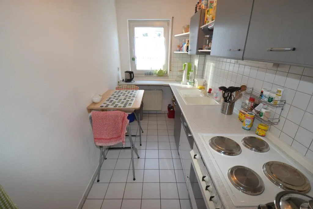Der Küchenboden ist gefliest. Die Küche ist mit einer gebrauchten Einbauküche ausgestattet. Die Einbauküche ist ausgestattet mit einem älteren Herd mit Backofen, einem Kühlschrank mit Gefrierfach, Ober- und Unterschränken. In der Küche ist Platz für eine Spülmaschine. Für die künftige Funktionsfähigkeit der E-Geräte übernimmt der Vermieter keine Haftung.