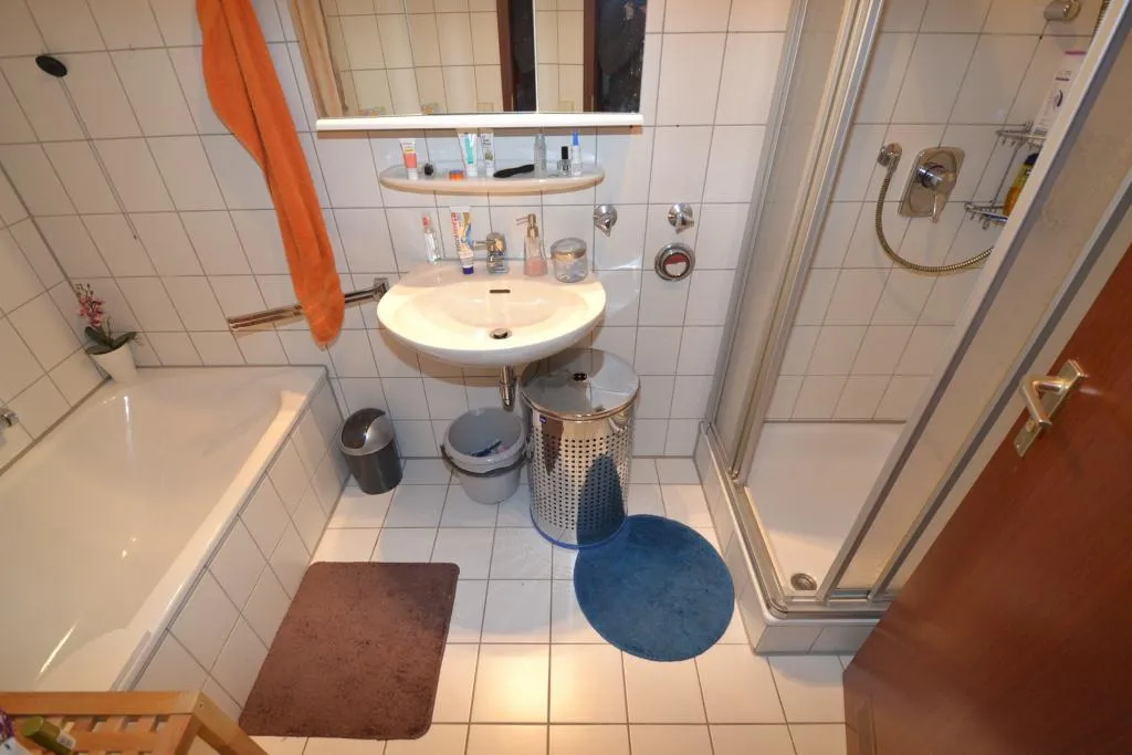 Das Badezimmer ist raumhoch gefliest und ist ausgestattet mit einem Fliesenboden, einer Badewanne, einer Dusche, einem Spiegelschrank sowie einem Badezimmerschrank.