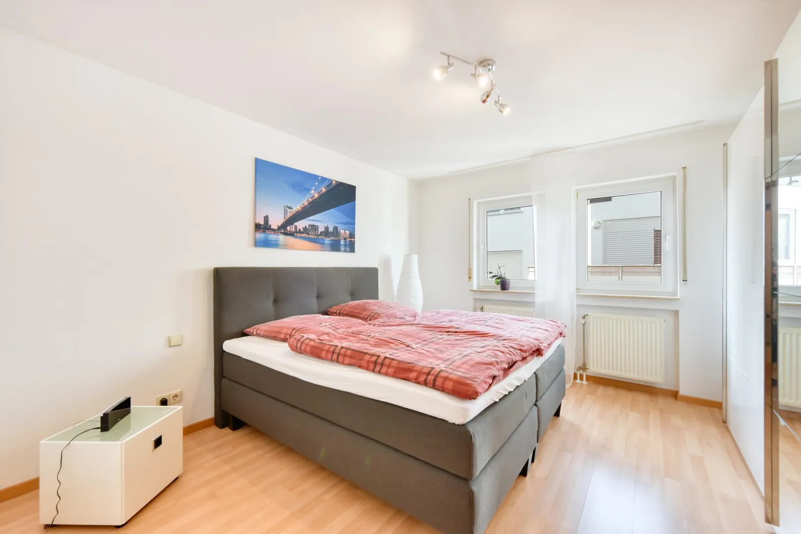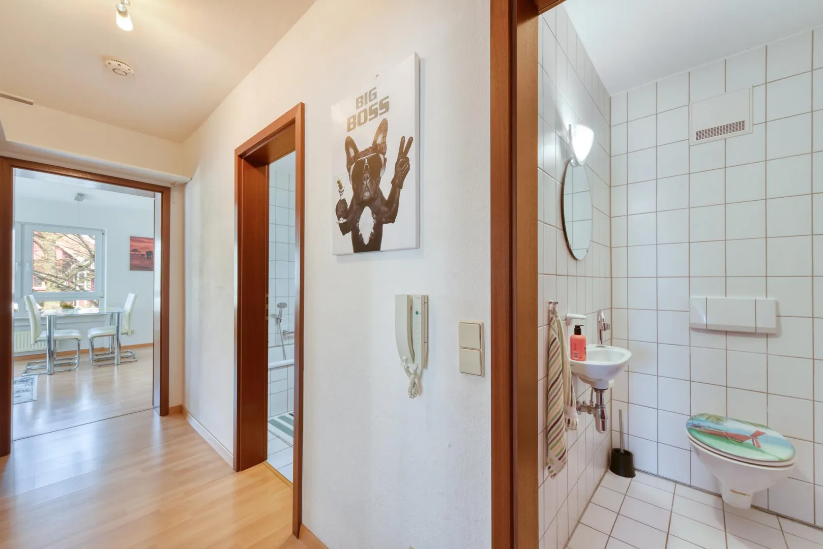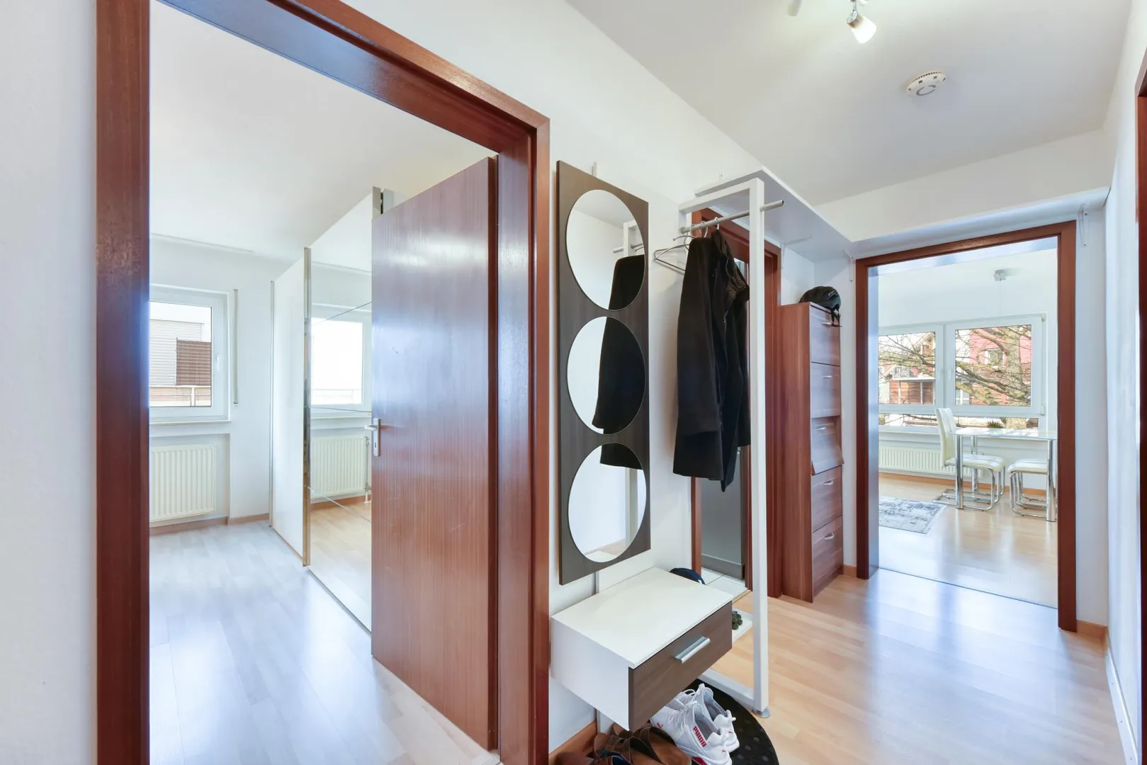 2009 wurde in den Zimmern und im Flur Laminatboden verlegt. Im Flur gibt es einen Schuhschrank sowie eine Garderobe.