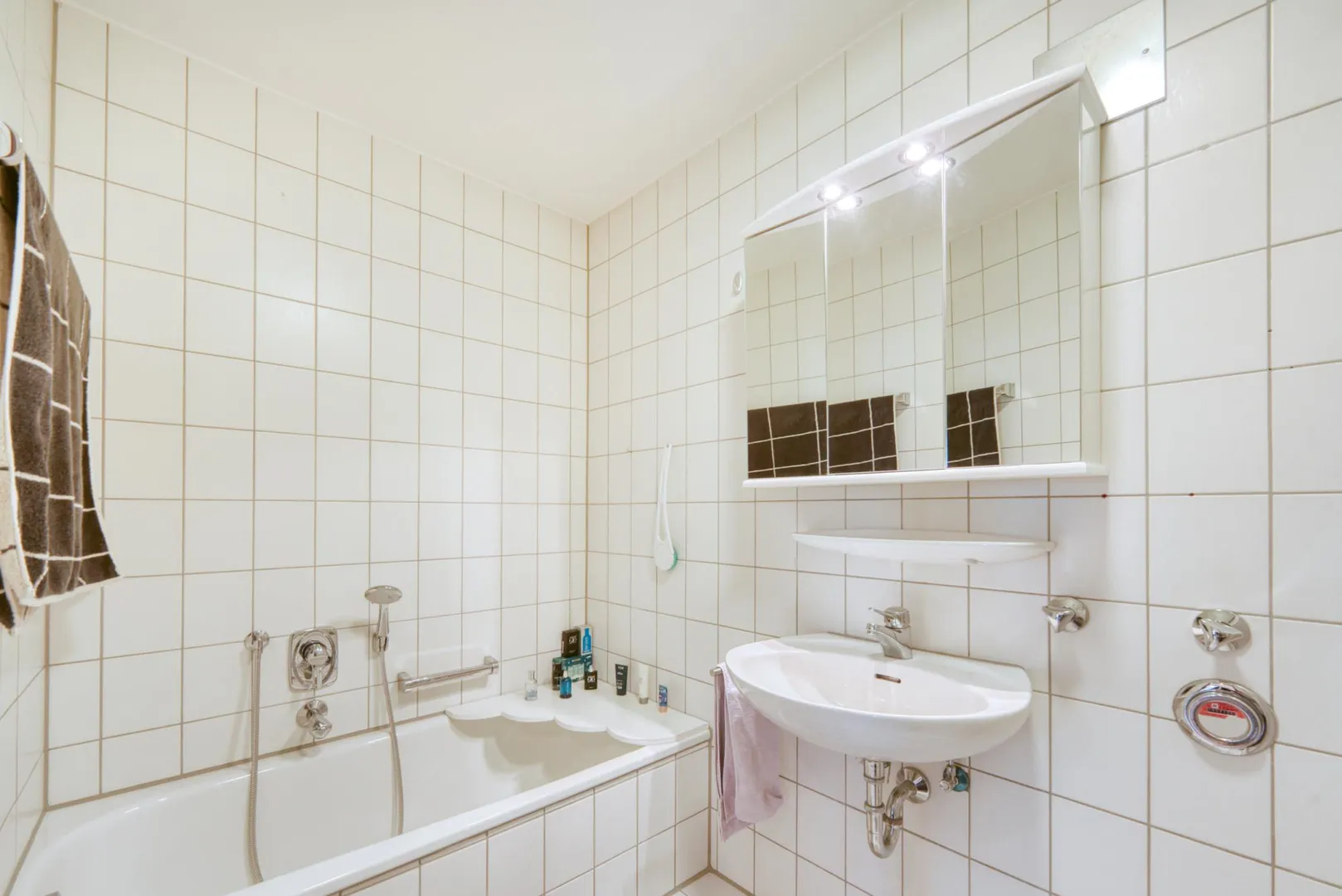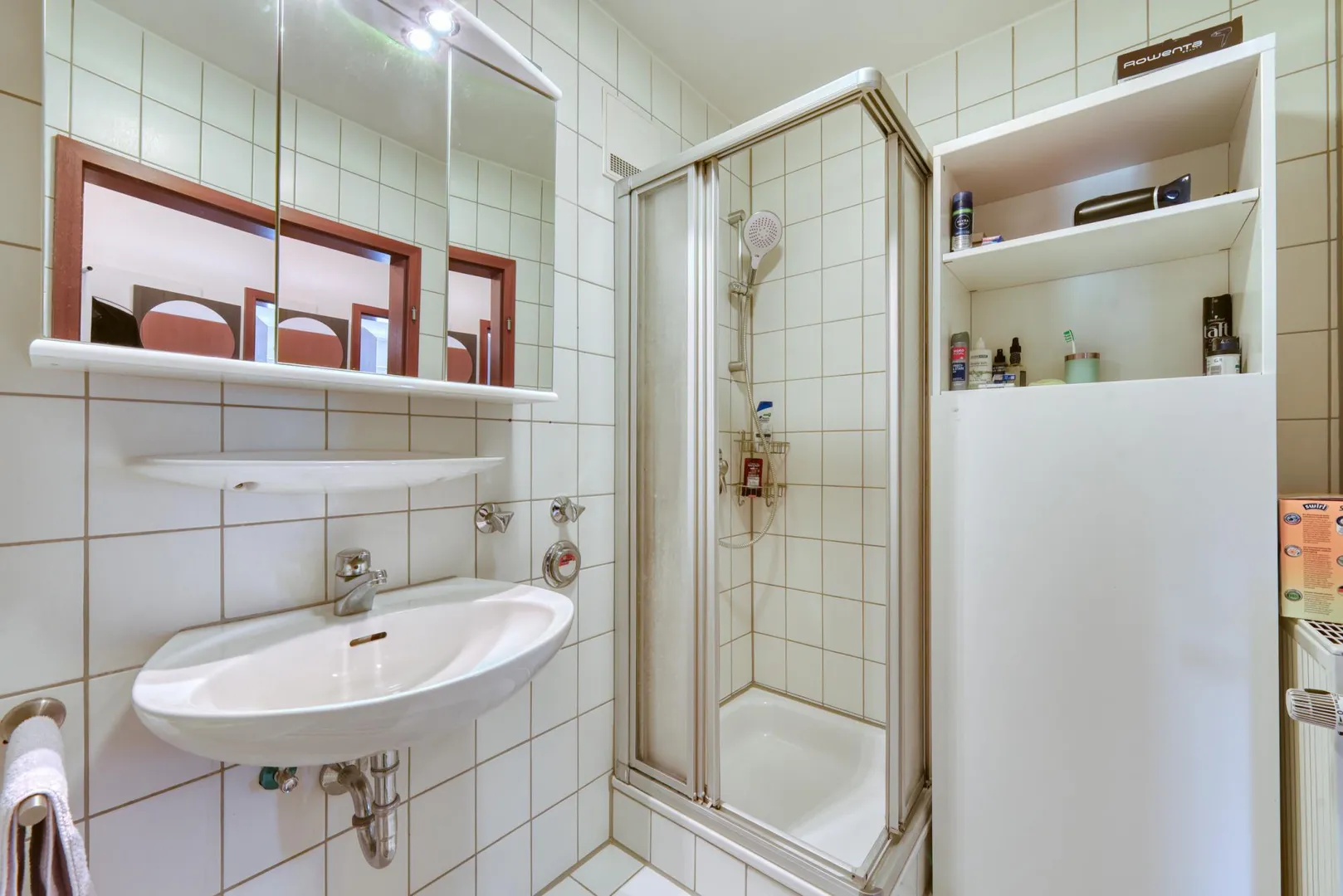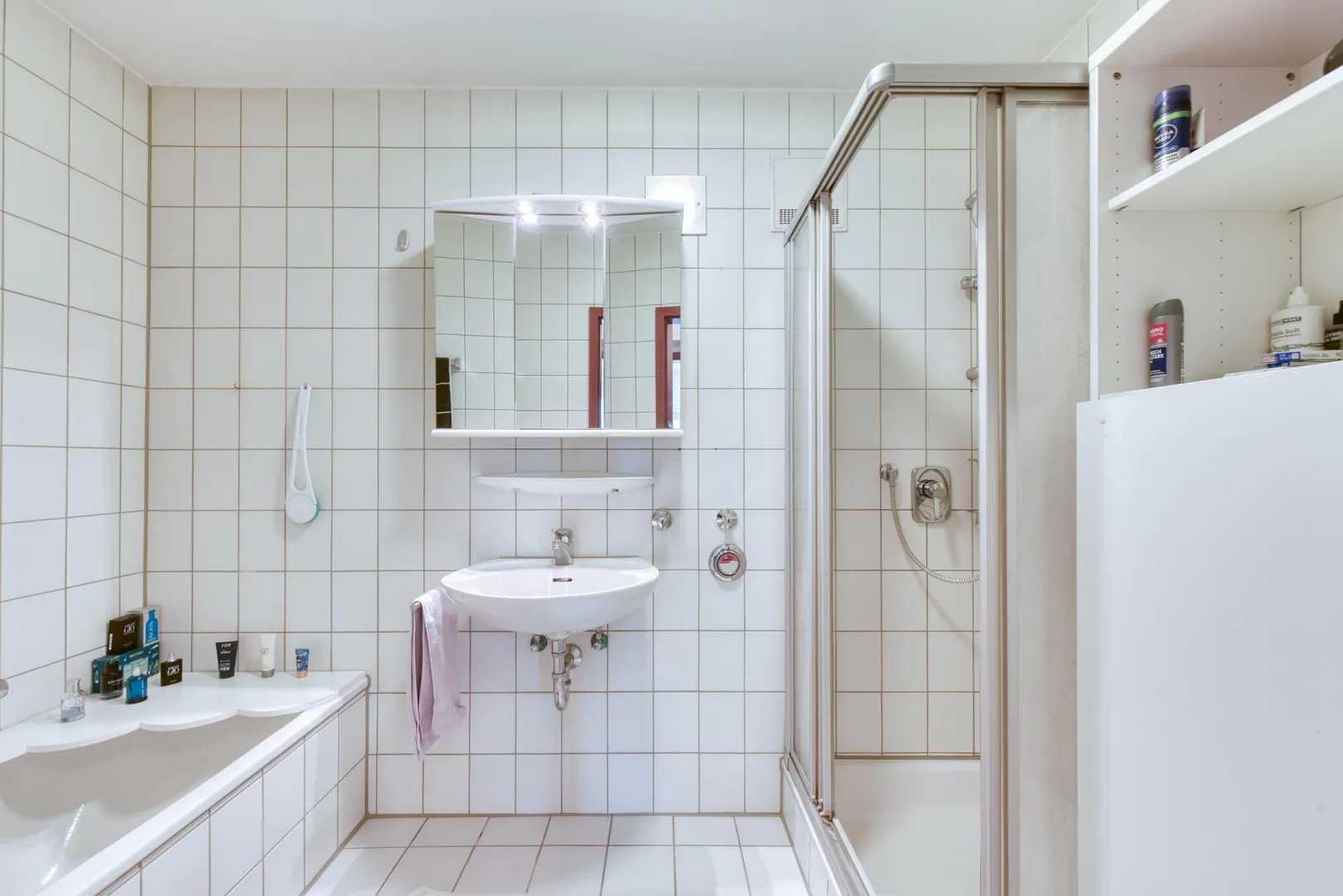 Das Badezimmer ist raumhoch gefliest und ist ausgestattet mit einem Fliesenboden, einer Badewanne, einer Dusche, einem Spiegelschrank sowie einem Badezimmerschrank.
