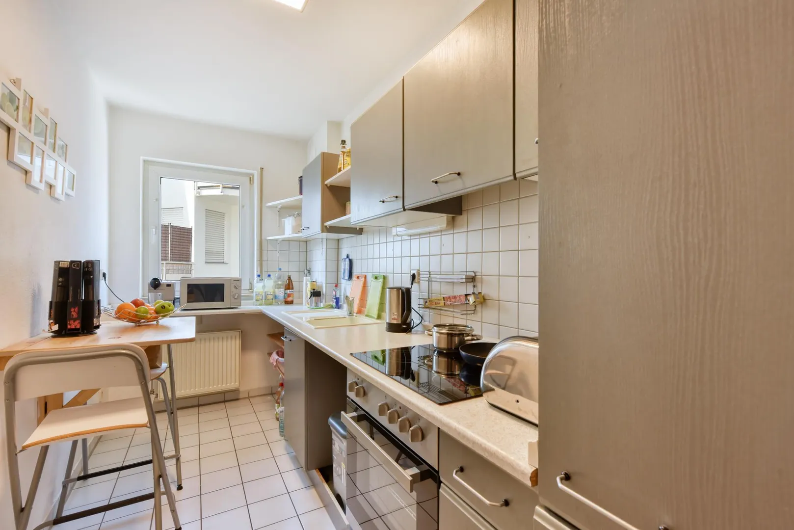 Die Küche ist mit einem Fliesenboden sowie Einbaumöbeln ausgestattet. Die E-Geräte können vom Vormieter für 400 EUR VB übernommen werden. Eine Spülmaschine ist nicht vorhanden. Platz für Spülmaschine ist vorhanden.