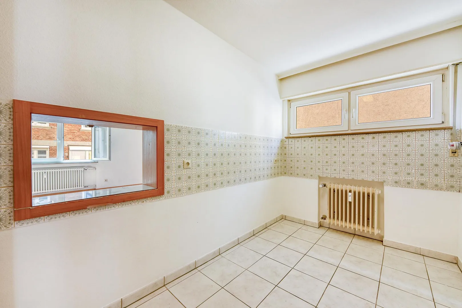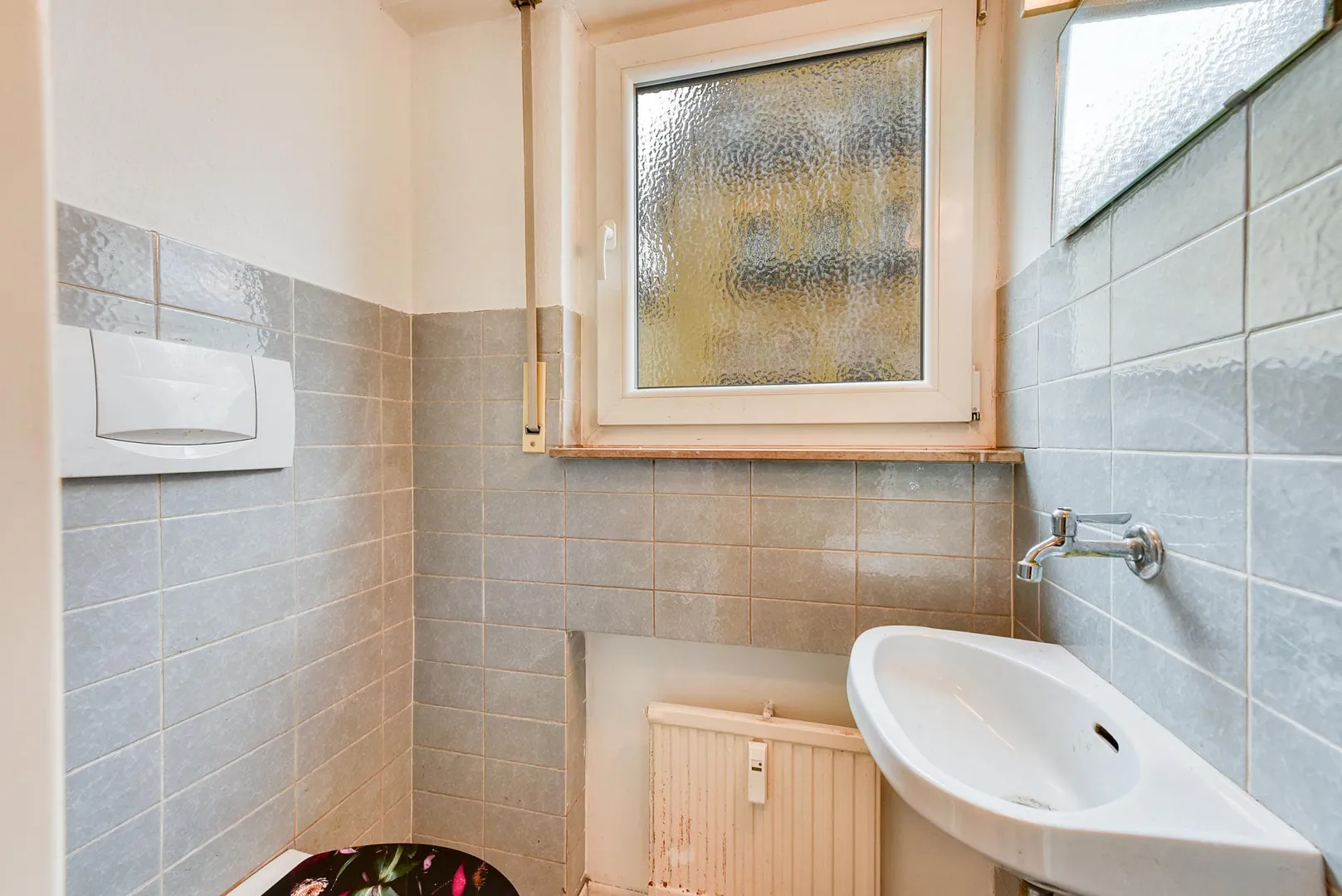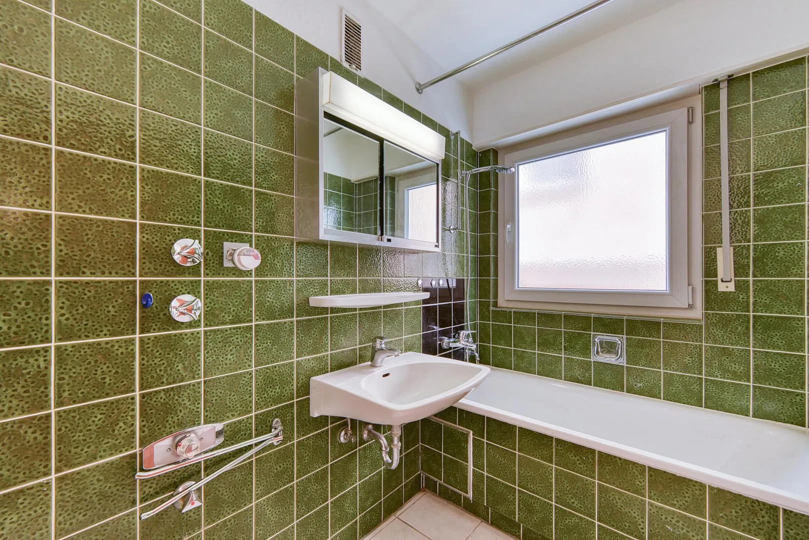 Das 2/3-hoch geflieste Tageslicht-Bad aus dem Ursprungsbaujahr ist ausgestattet mit einer Badewanne.
