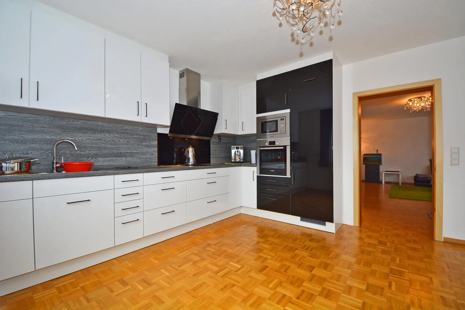 Der ca. 12 m² große und überdachte Süd-Balkon ist über die Küche begehbar und mit einer Markise ausgestattet.