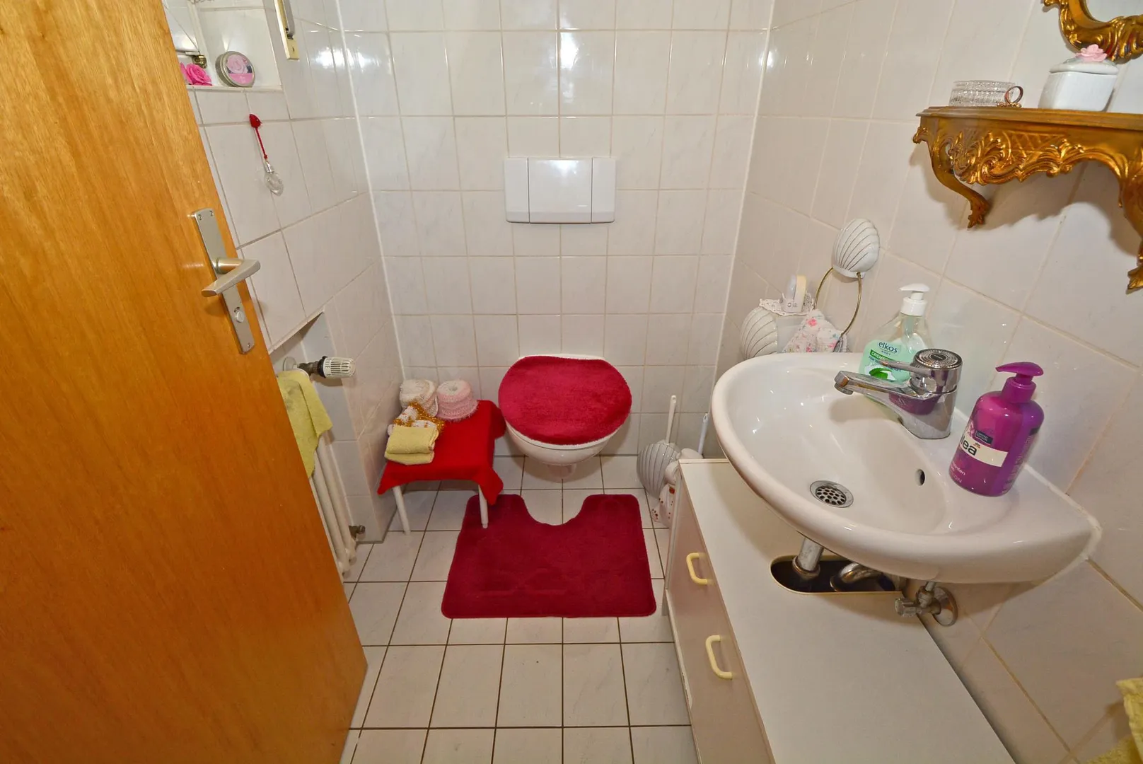 Das raumhoch geflieste Badezimmer verfügt über ein Fenster, eine Badewanne, eine Dusche sowie ein Waschbecken. Das WC mit Fenster ist separat.