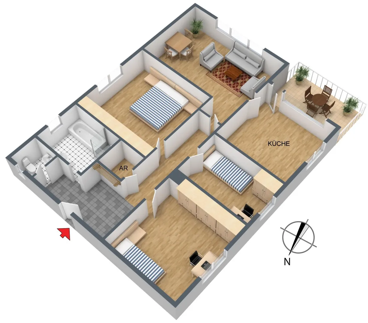 Der Grundriss der Wohnung ist sehr gut. Alle Zimmer sind vom Flur aus begehbar. In der Wohnung befindet sich ein Abstellraum. Die Küche ist über das Wohnzimmer begehbar.